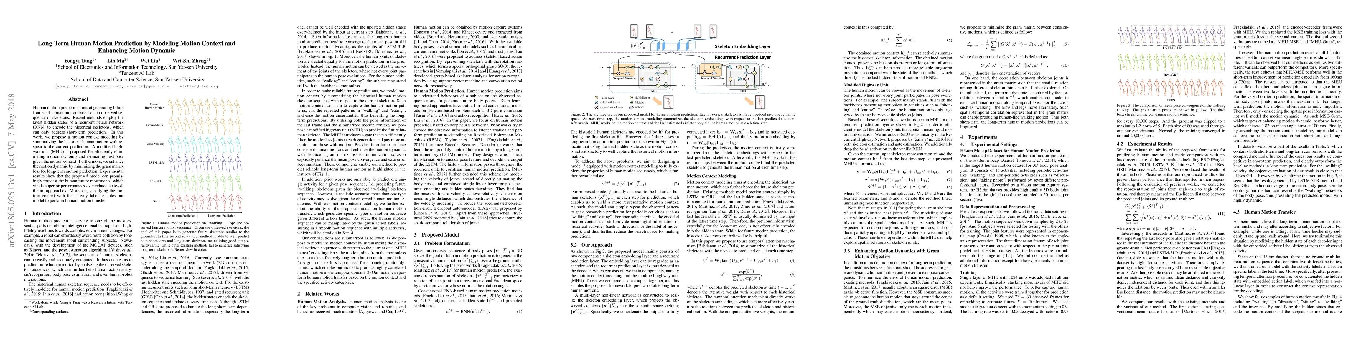 This paper proposes a method for long-term human motion prediction by modeling motion context and enhancing motion dynamics. It introduces a modified highway unit to eliminate motionless joints and a gram matrix loss minimization technique for long-term predictions, outperforming existing state-of-the-art methods.