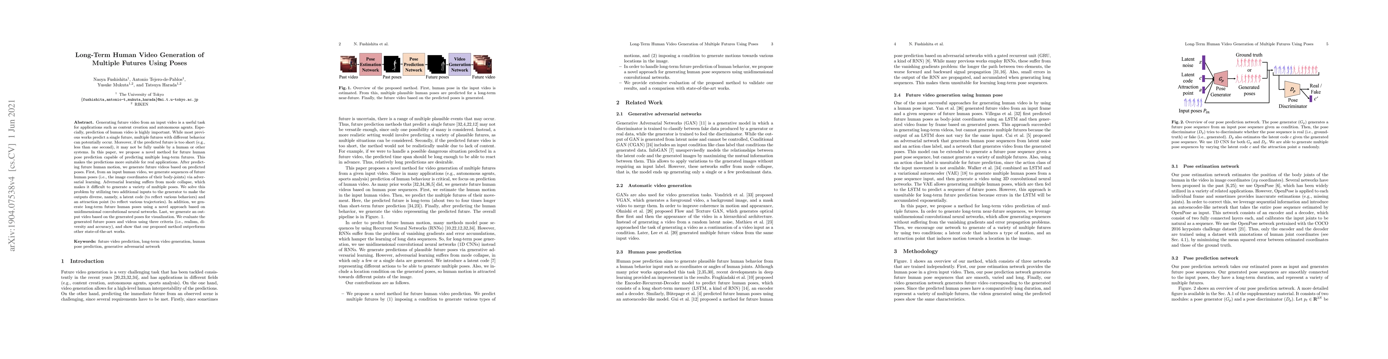 Predicting future human behavior from an input human video is a useful task for applications such as autonomous driving and robotics. While most previous works predict a single future, multiple futures with different behavior can potentially occur. Moreover, if the predicted future is too short (e.g., less than one second), it may not be fully usable by a human or other systems. In this paper, we propose a novel method for future human pose prediction capable of predicting multiple long-term futures. This makes the predictions more suitable for real applications. Also, from the input video and the predicted human behavior, we generate future videos. First, from an input human video, we generate sequences of future human poses (i.e., the image coordinates of their body-joints) via adversarial learning. Adversarial learning suffers from mode collapse, which makes it difficult to generate a variety of multiple poses. We solve this problem by utilizing two additional inputs to the generator to make the outputs diverse, namely, a latent code (to reflect various behaviors) and an attraction point (to reflect various trajectories). In addition, we generate long-term future human poses using a novel approach based on unidimensional convolutional neural networks. Last, we generate an output video based on the generated poses for visualization. We evaluate the generated future poses and videos using three criteria (i.e., realism, diversity and accuracy), and show that our proposed method outperforms other state-of-the-art works.