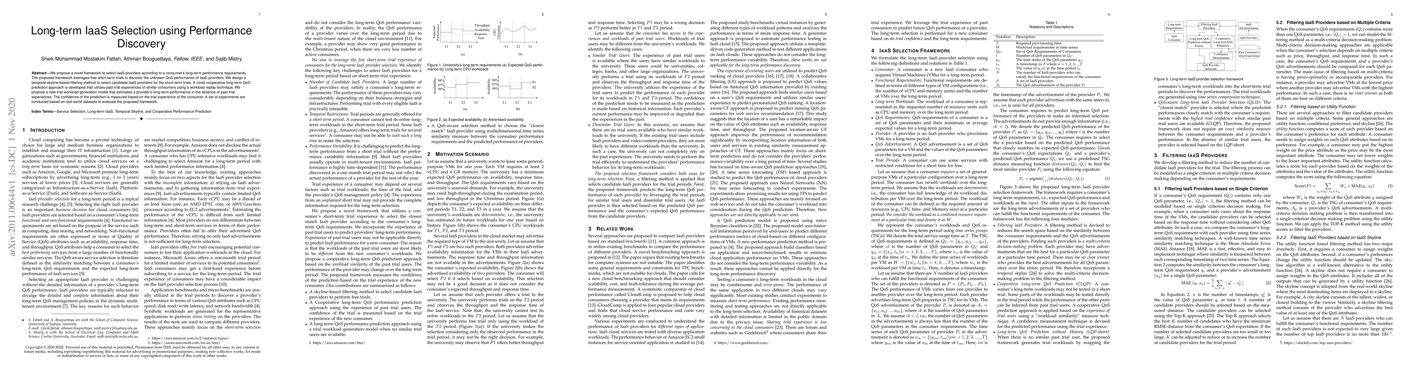 A new framework is proposed to select IaaS providers based on long-term performance requirements, using short-term trials and a predictive model to estimate future QoS performance.