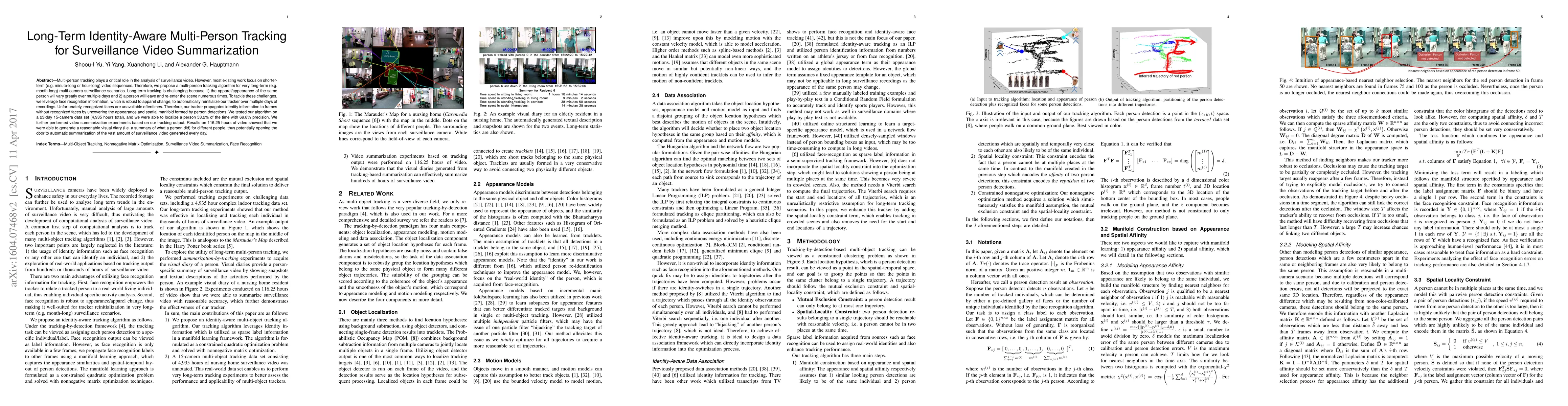 This paper proposes a long-term multi-person tracking algorithm for month-long surveillance videos, addressing challenges like significant appearance changes and frequent scene reentries. The algorithm uses face recognition for identity reinitialization and appearance manifold propagation to track individuals across days, achieving 53.2% localization with 69.8% precision over a 23-day, 15-camera dataset. It also demonstrates effective video summarization, generating visual diaries for individuals.