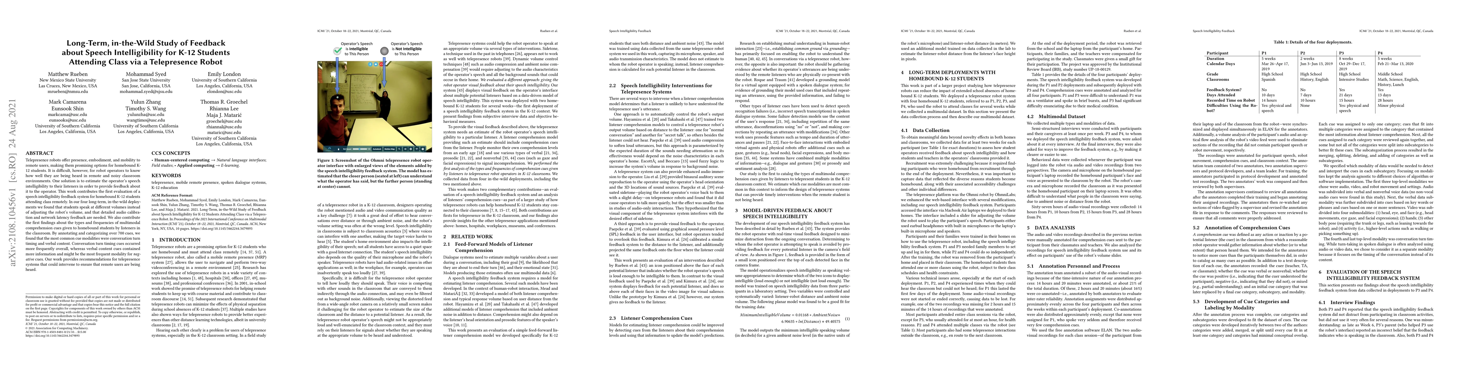 This study evaluates a speech intelligibility feedback system for K-12 students using telepresence robots, revealing that students adjust their volume rather than the robot's, and highlighting the need for audio calibration and network latency feedback. The research also identifies common multimodal comprehension cues given by classroom listeners, with turn timing cues being most frequent.
