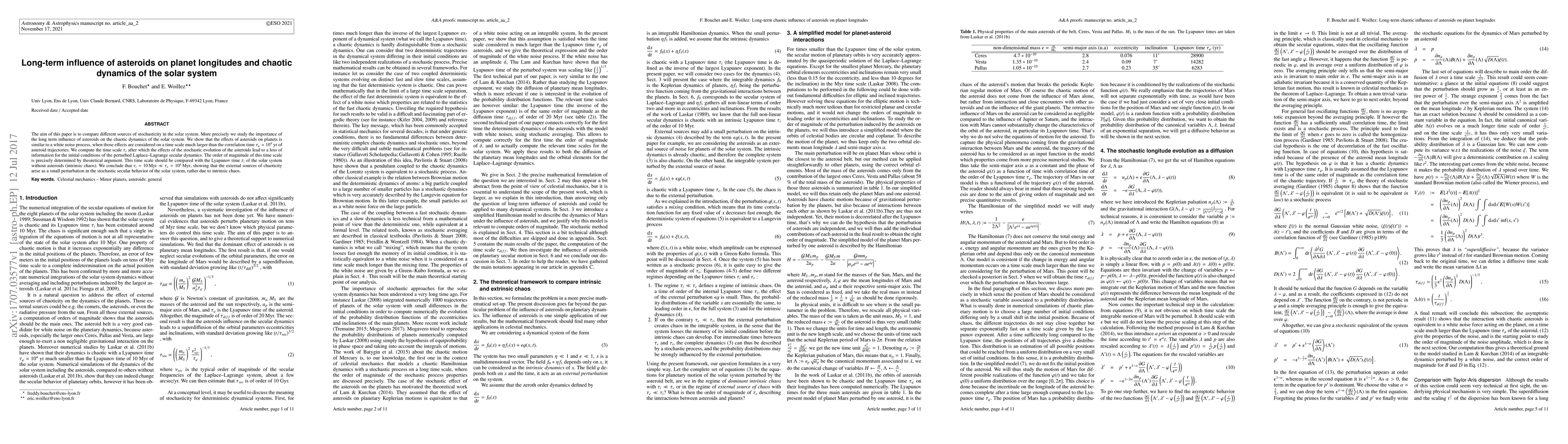 This paper investigates the long-term influence of asteroids on planet longitudes and the chaotic dynamics of the solar system, demonstrating that asteroid effects resemble a white noise process over timescales much larger than the correlation time of asteroid trajectories. The study finds that the time scale for information loss due to asteroid-induced stochastic effects is significantly longer than the intrinsic chaos time scale of the solar system, suggesting asteroids contribute minimally to the overall chaotic dynamics.