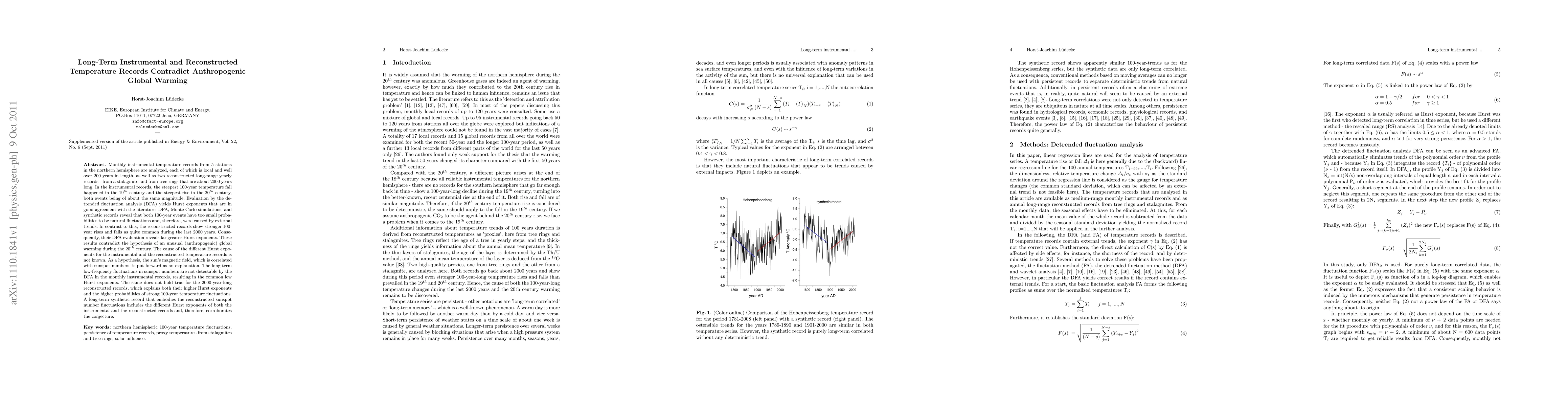 Monthly instrumental temperature records from 5 stations in the northern hemisphere are analyzed, each of which is local and over 200 years in length, as well as two reconstructed long-range yearly records - from a stalagmite and from tree rings that are about 2000 years long. In the instrumental records, the steepest 100-year temperature fall happened in the 19th century and the steepest rise in the 20th century, both events being of about the same magnitude. Evaluation by the detrended fluctuation analysis (DFA) yields Hurst exponents that are in good agreement with the literature. DFA, Monte Carlo simulations, and synthetic records reveal that both 100-year events were caused by external trends. In contrast to this, the reconstructed records show stronger 100-year rises and falls as quite common during the last 2000 years. These results contradict the hypothesis of an unusual (anthropogenic) global warming during the 20th century. As a hypothesis, the sun's magnetic field, which is correlated with sunspot numbers, is put forward as an explanation. The long-term low-frequency fluctuations in sunspot numbers are not detectable by the DFA in the monthly instrumental records, resulting in the common low Hurst exponents. The same does not hold true for the 2000-year-long reconstructed records, which explains both their higher Hurst exponents and the higher probabilities of strong 100-year temperature fluctuations. A long-term synthetic record that embodies the reconstructed sunspot number fluctuations includes the different Hurst exponents of both the instrumental and the reconstructed records and, therefore, corroborates the conjecture.