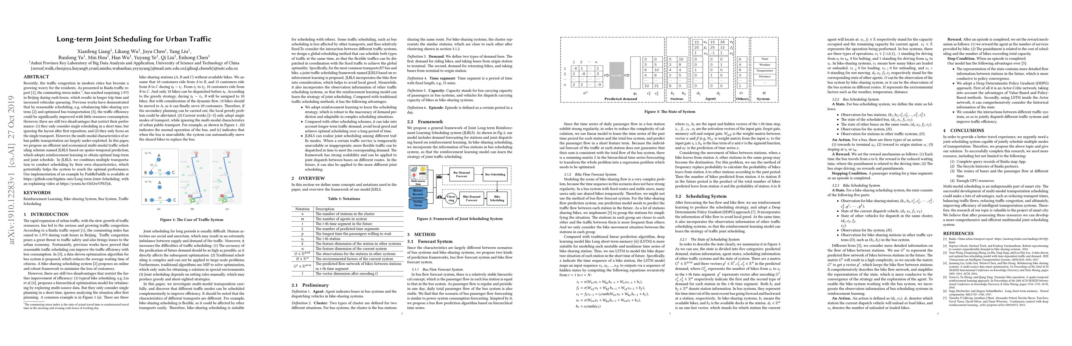 Recently, the traffic congestion in modern cities has become a growing worry for the residents. As presented in Baidu traffic report, the commuting stress index has reached surprising 1.973 in Beijing during rush hours, which results in longer trip time and increased vehicular queueing. Previous works have demonstrated that by reasonable scheduling, e.g, rebalancing bike-sharing systems and optimized bus transportation, the traffic efficiency could be significantly improved with little resource consumption. However, there are still two disadvantages that restrict their performance: (1) they only consider single scheduling in a short time, but ignoring the layout after first reposition, and (2) they only focus on the single transport. However, the multi-modal characteristics of urban public transportation are largely under-exploited. In this paper, we propose an efficient and economical multi-modal traffic scheduling scheme named JLRLS based on spatio -temporal prediction, which adopts reinforcement learning to obtain optimal long-term and joint schedule. In JLRLS, we combines multiple transportation to conduct scheduling by their own characteristics, which potentially helps the system to reach the optimal performance. Our implementation of an example by PaddlePaddle is available at https://github.com/bigdata-ustc/Long-term-Joint-Scheduling, with an explaining video at https://youtu.be/t5M2wVPhTyk.