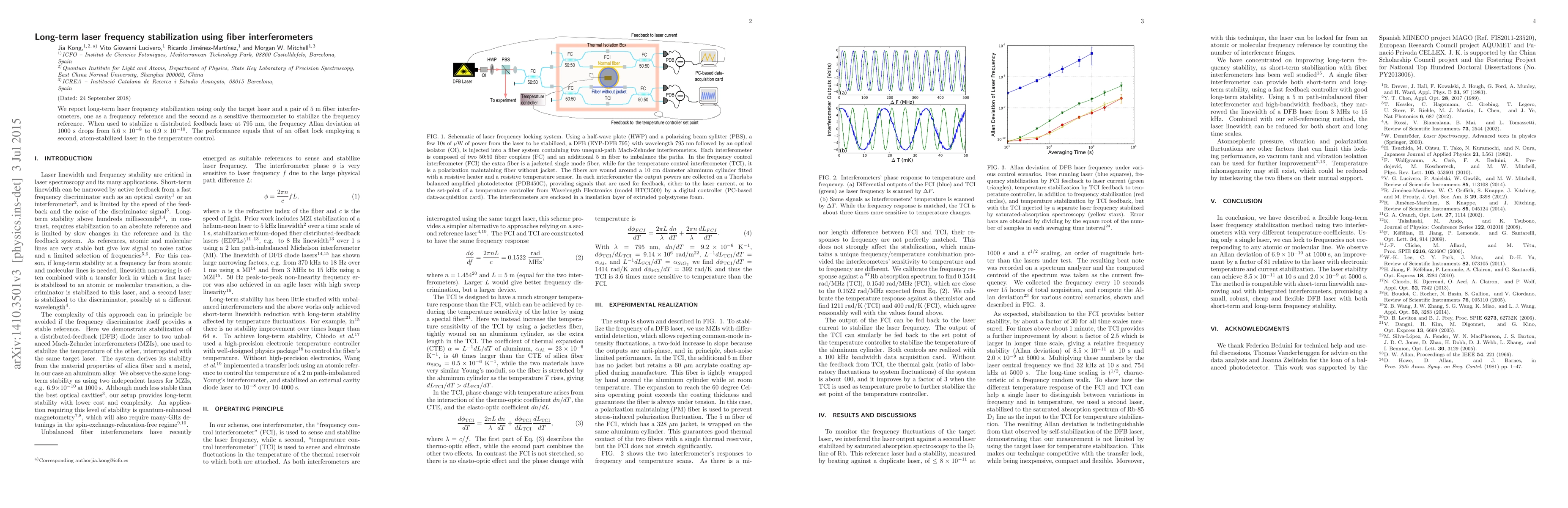 We report long-term laser frequency stabilization using only the target laser and a pair of 5 m fiber interferometers, one as a frequency reference and the second as a sensitive thermometer to stabilize the frequency reference. When used to stabilize a distributed feedback laser at 795 nm, the frequency Allan deviation at 1000 s drops from 5.6*10^{-8} to 6.9*10^{-10}. The performance equals that of an offset lock employing a second, atom-stabilized laser in the temperature control.