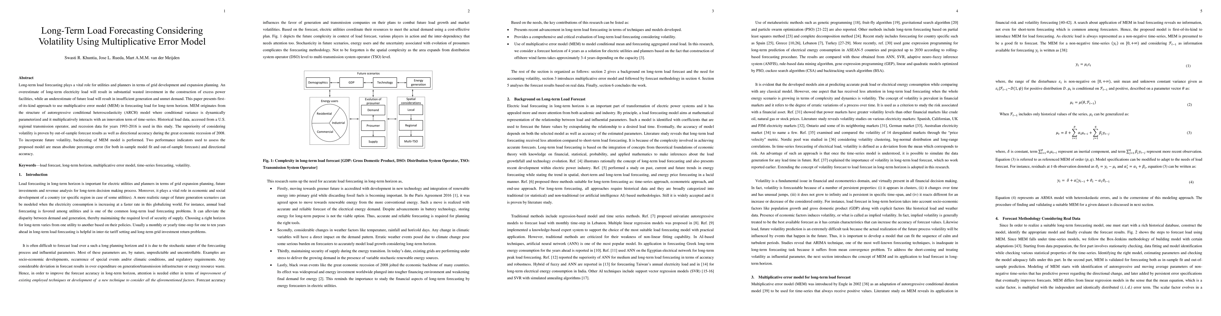 Long-term load forecasting plays a vital role for utilities and planners in terms of grid development and expansion planning. An overestimate of long-term electricity load will result in substantial wasted investment in the construction of excess power facilities, while an underestimate of future load will result in insufficient generation and unmet demand. This paper presents first-of-its-kind approach to use multiplicative error model (MEM) in forecasting load for long-term horizon. MEM originates from the structure of autoregressive conditional heteroscedasticity (ARCH) model where conditional variance is dynamically parameterized and it multiplicatively interacts with an innovation term of time-series. Historical load data, accessed from a U.S. regional transmission operator, and recession data for years 1993-2016 is used in this study. The superiority of considering volatility is proven by out-of-sample forecast results as well as directional accuracy during the great economic recession of 2008. To incorporate future volatility, backtesting of MEM model is performed. Two performance indicators used to assess the proposed model are mean absolute percentage error (for both in-sample model fit and out-of-sample forecasts) and directional accuracy.