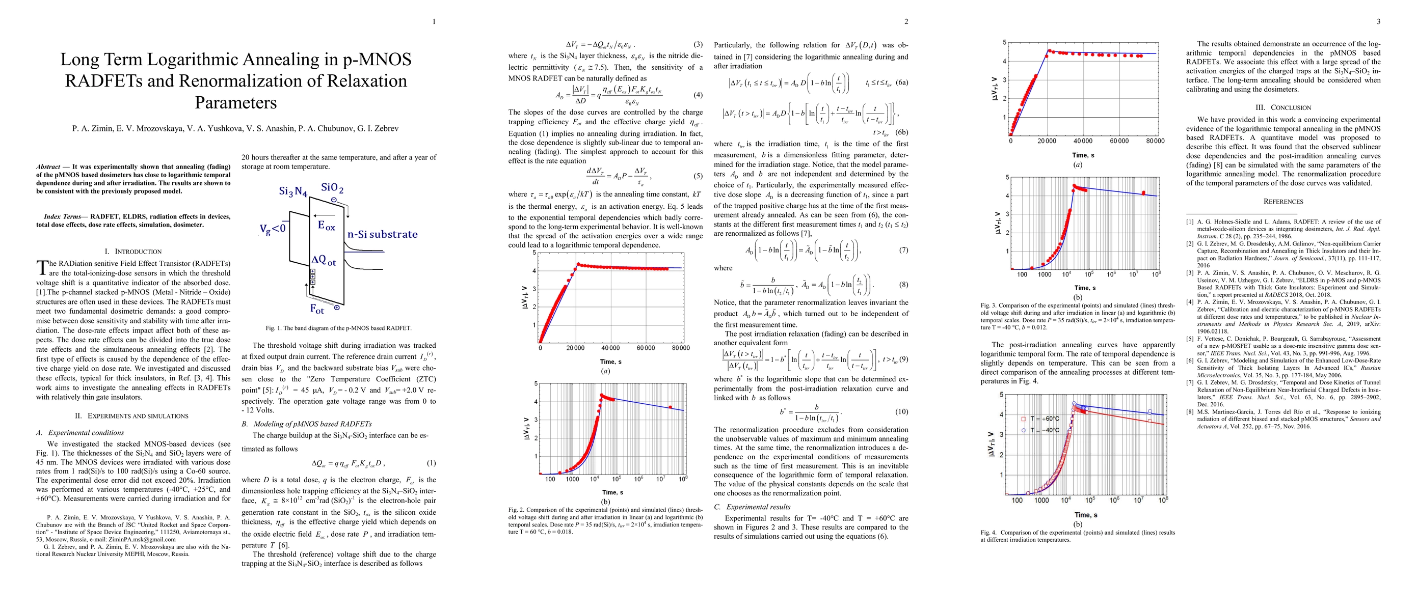 It was experimentally shown that annealing (fading) of the pMNOS based dosimeters has close to logarithmic temporal dependence during and after irradiation. The results are shown to be consistent with the previously proposed model.