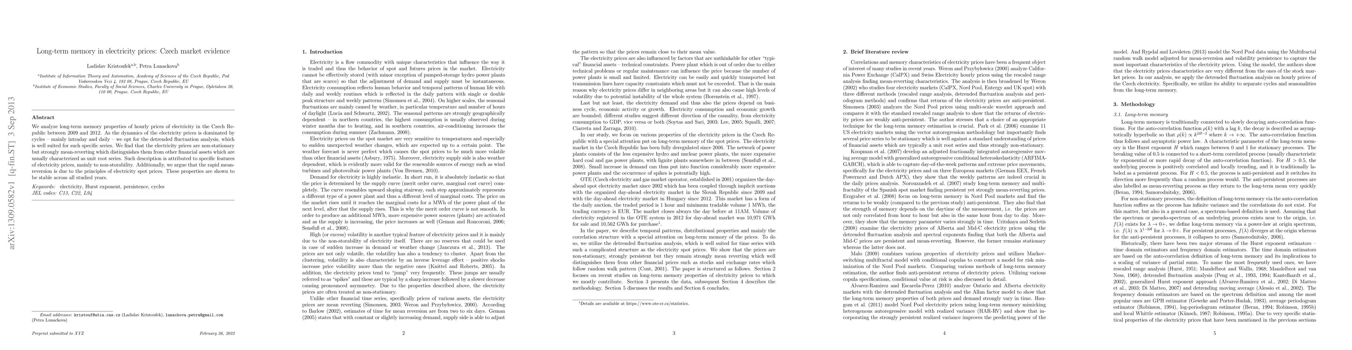 This study examines the long-term memory properties of electricity prices in the Czech market from 2009 to 2012, revealing that prices exhibit strong mean-reversion despite being non-stationary, a feature attributed to the non-storability of electricity and the principles governing spot prices. The findings suggest these characteristics are consistent across the analyzed years.