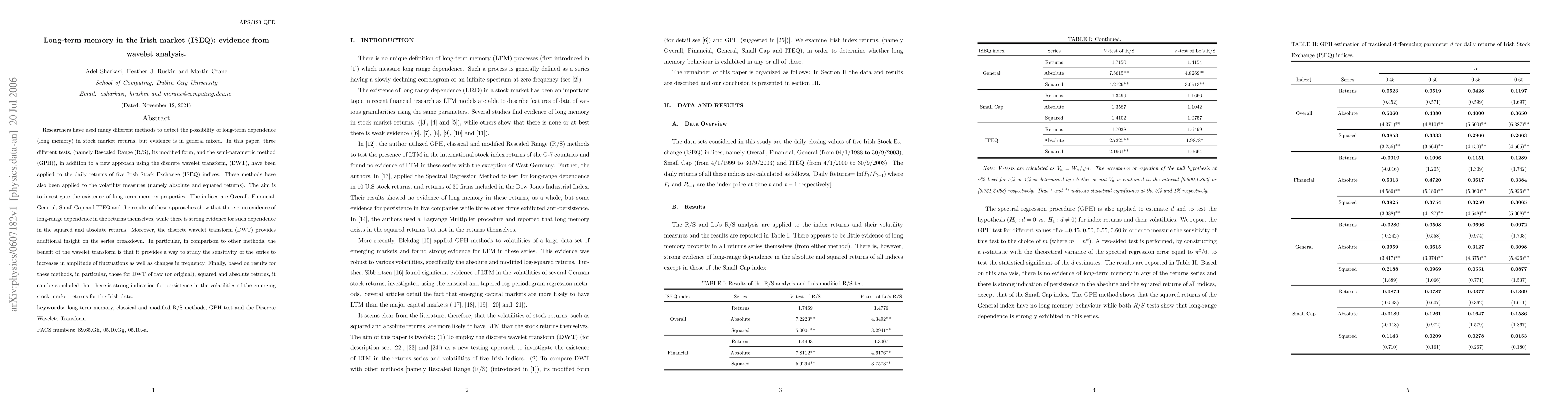 This paper investigates long-term memory properties in the Irish stock market (ISEQ) using various tests, including wavelet analysis. While no long-range dependence is found in stock returns, strong evidence of such dependence is observed in the volatility measures, indicating persistence in volatility.