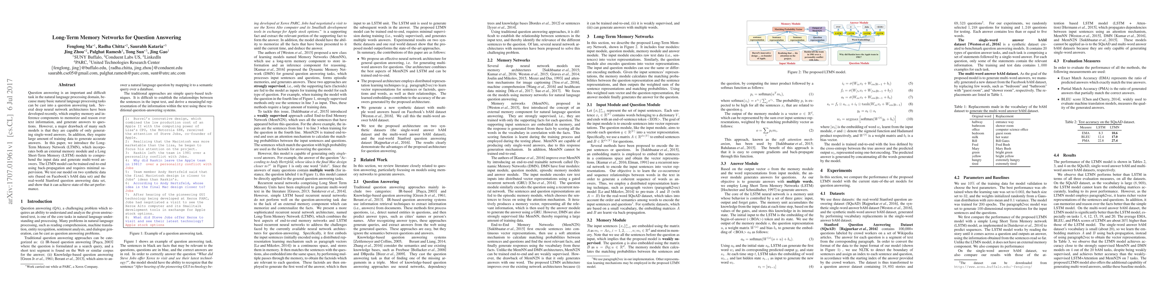 This paper introduces the Long-Term Memory Network (LTMN) for question answering, combining an external memory module with an LSTM to generate multi-word answers. The model achieves state-of-the-art performance on both synthetic and real-world datasets, requiring minimal supervision.