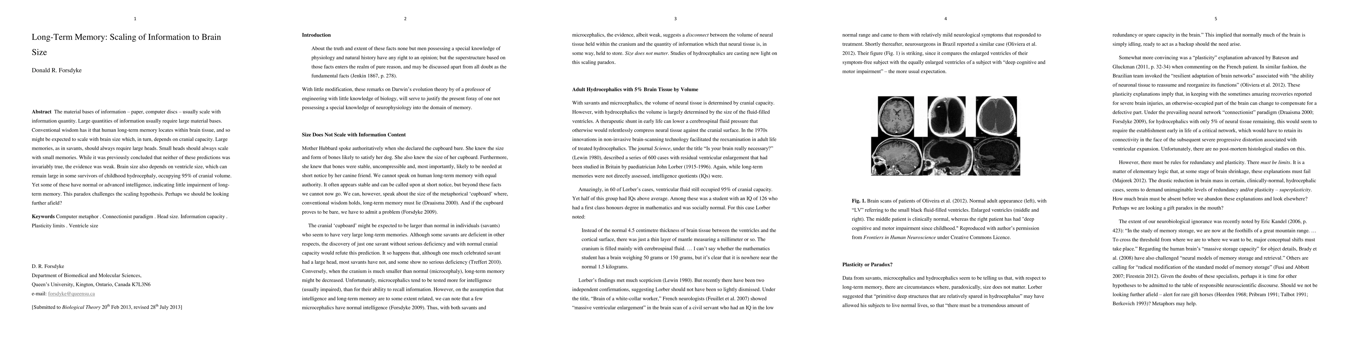 The material bases of information - paper, computer discs - usually scale with information quantity. Large quantities of information usually require large material bases. Conventional wisdom has it that human long-term memory locates within brain tissue, and so might be expected to scale with brain size which, in turn, depends on cranial capacity. Large memories, as in savants, should always require large heads. Small heads should always scale with small memories. While it was previously concluded that neither of these predictions was invariably true, the evidence was weak. Brain size also depends on ventricle size, which can remain large in some survivors of childhood hydrocephaly, occupying 95% of cranial volume. Yet some of these have normal or advanced intelligence, indicating little impairment of long-term memory. This paradox challenges the scaling hypothesis. Perhaps we should be looking further afield?