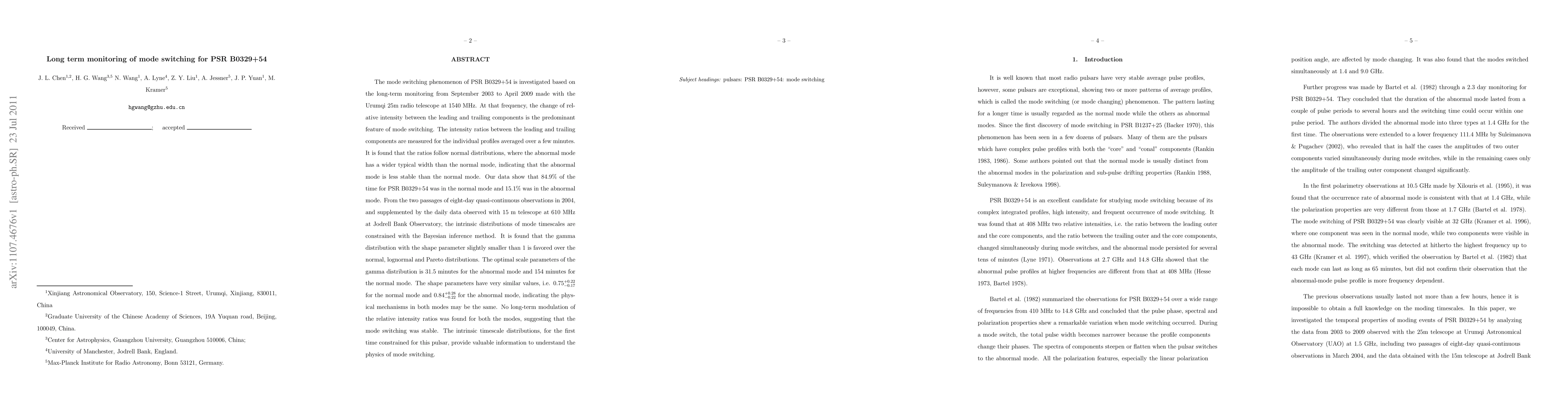 Researchers monitored PSR B0329+54's mode switching using radio telescopes, finding 84.9% of time in normal mode and 15.1% in abnormal mode, with the abnormal mode being less stable; they also constrained intrinsic distribution of timescales with a gamma distribution.