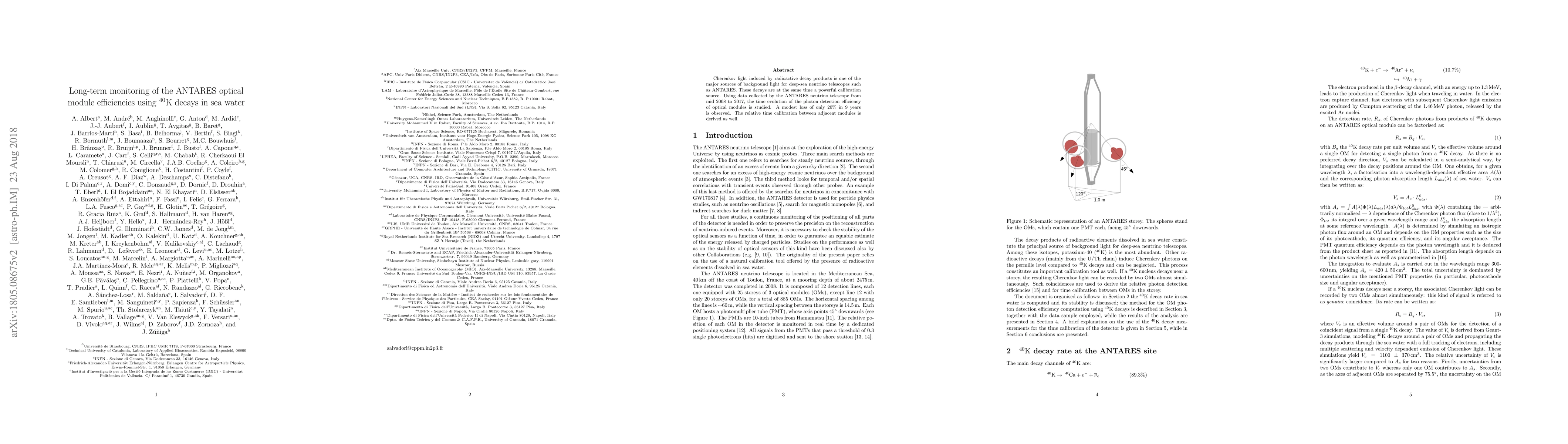 Cherenkov light induced by radioactive decay products is one of the major sources of background light for deep-sea neutrino telescopes such as ANTARES. These decays are at the same time a powerful calibration source. Using data collected by the ANTARES neutrino telescope from mid 2008 to 2017, the time evolution of the photon detection efficiency of optical modules is studied. A modest loss of only 20% in 9 years is observed. The relative time calibration between adjacent modules is derived as well.
