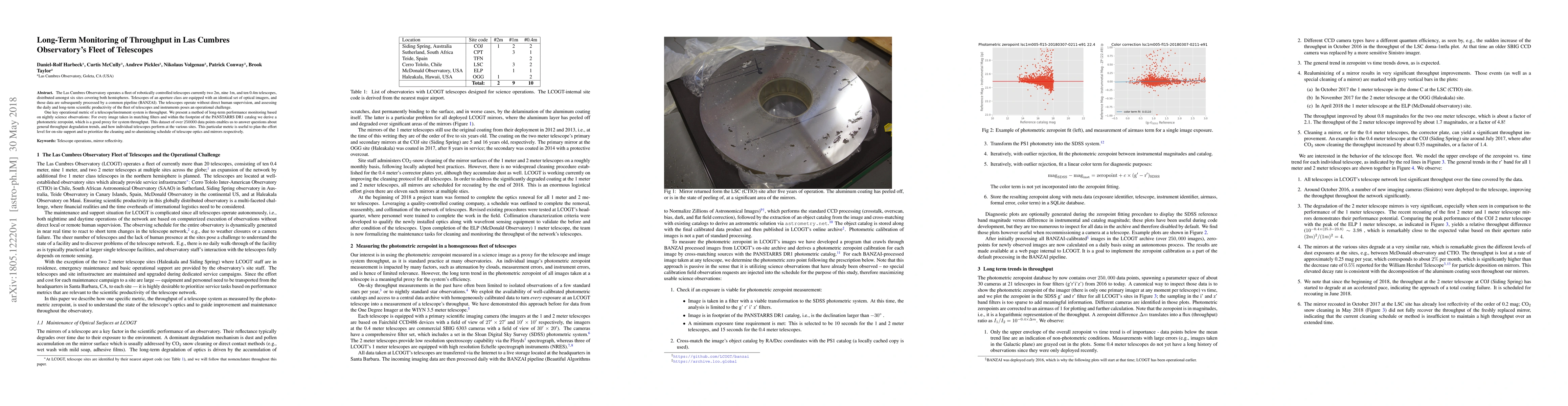 This paper details a method for long-term monitoring of throughput in the Las Cumbres Observatory's telescope fleet using nightly science observations. A photometric zeropoint, derived from images within PANSTARRS DR1 catalog footprint, serves as a throughput proxy. The dataset of over 250,000 points aids in assessing general degradation trends and individual telescope performance across sites, informing maintenance scheduling and resource allocation.