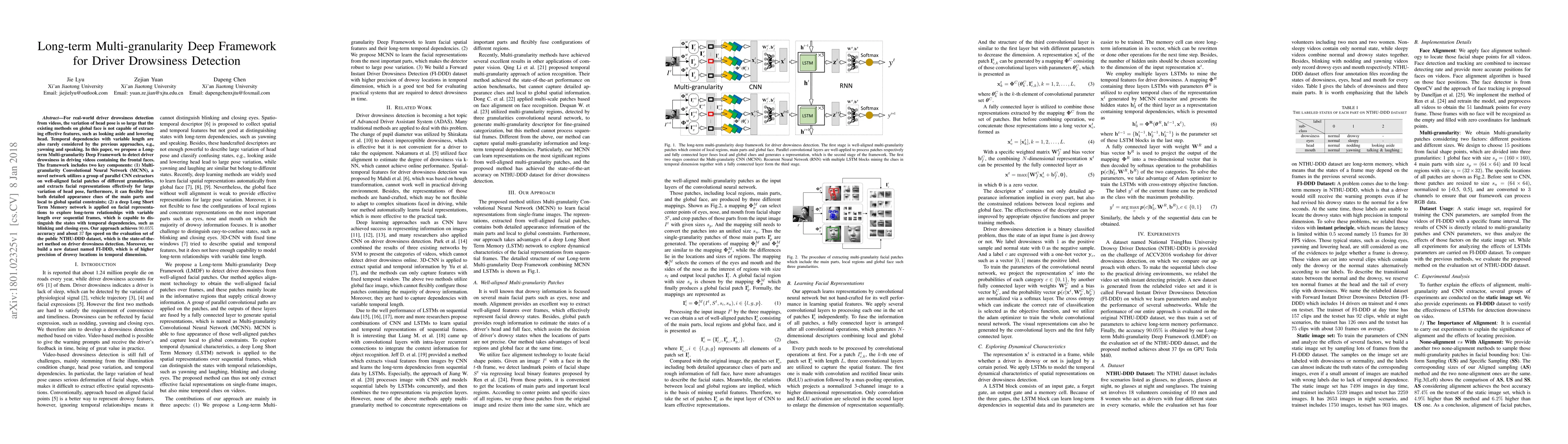 This paper proposes a Long-term Multi-granularity Deep Framework for detecting driver drowsiness using videos. It employs a Multi-granularity Convolutional Neural Network (MCNN) to extract effective facial features and a deep Long Short Term Memory network to capture temporal dependencies, achieving 90.05% accuracy and 37 fps speed on the NTHU-DDD dataset.