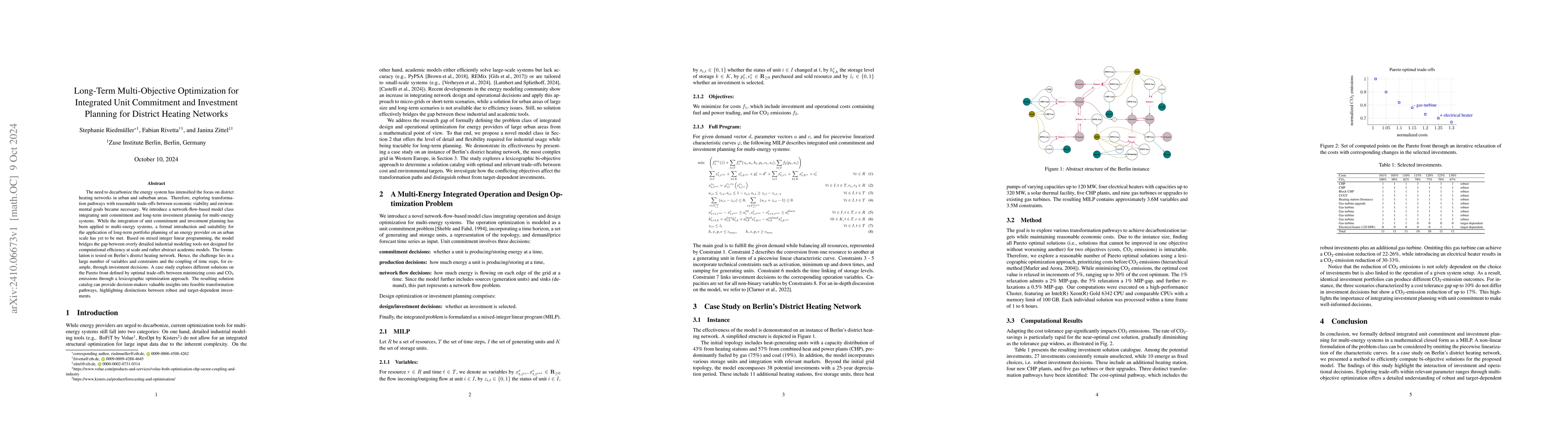 This paper presents a mixed integer linear programming model for long-term multi-objective optimization integrating unit commitment and investment planning in district heating networks. The approach aims to find optimal trade-offs between cost and CO2 emissions, providing decision-makers with insights into feasible transformation pathways for urban energy systems.
