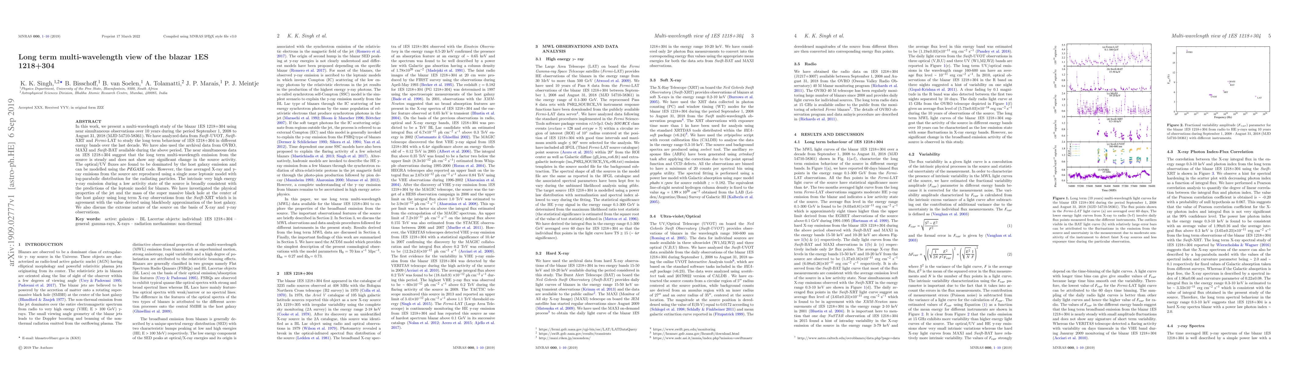 This study presents a decade-long multi-wavelength analysis of the blazar 1ES 1218+304, revealing steady emission without significant activity changes. The optical/UV flux is dominated by host galaxy emission, while X-ray and gamma-ray emissions are modeled using a single zone leptonic model.