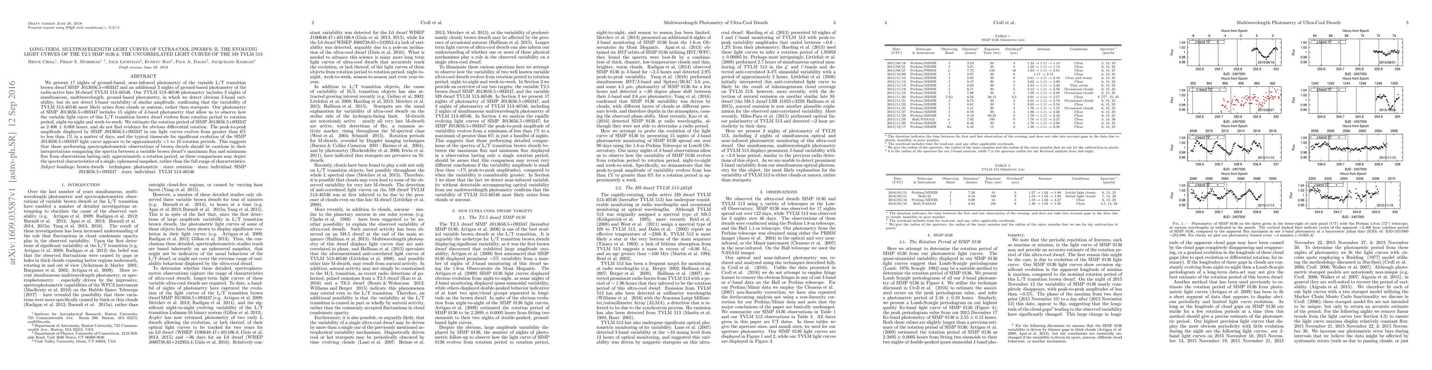 We present 17 nights of ground-based, near-infrared photometry of the variable L/T transition brown dwarf SIMP J013656.5+093347 and an additional 3 nights of ground-based photometry of the radio-active late M-dwarf TVLM 513-46546. Our TVLM 513-46546 photometry includes 2 nights of simultaneous, multiwavelength, ground-based photometry, in which we detect obvious J-band variability, but do not detect I-band variability of similar amplitude, confirming that the variability of TVLM 513-46546 most likely arises from clouds or aurorae, rather than starspots. Our photometry of SIMP J013656.5+093347 includes 15 nights of J-band photometry that allow us to observe how the variable light curve of this L/T transition brown dwarf evolves from rotation period to rotation period, night-to-night and week-to-week. We estimate the rotation period of SIMP J013656.5+093347 as 2.406 +/- 0.008 hours, and do not find evidence for obvious differential rotation. The peak-to-peak amplitude displayed by SIMP J013656.5+093347 in our light curves evolves from greater than 6% to less than 1% in a matter of days, and the typical timescale for significant evolution of the SIMP J013656.5+093347 light curve appears to be approximately <1 to 10 rotation periods. This suggests that those performing spectrophotometric observations of brown dwarfs should be cautious in their interpretations comparing the spectra between a variable brown dwarf's maximum flux and minimum flux from observations lasting only approximately a rotation period, as these comparisons may depict the spectral characteristics of a single, ephemeral snapshot, rather than the full range of characteristics.