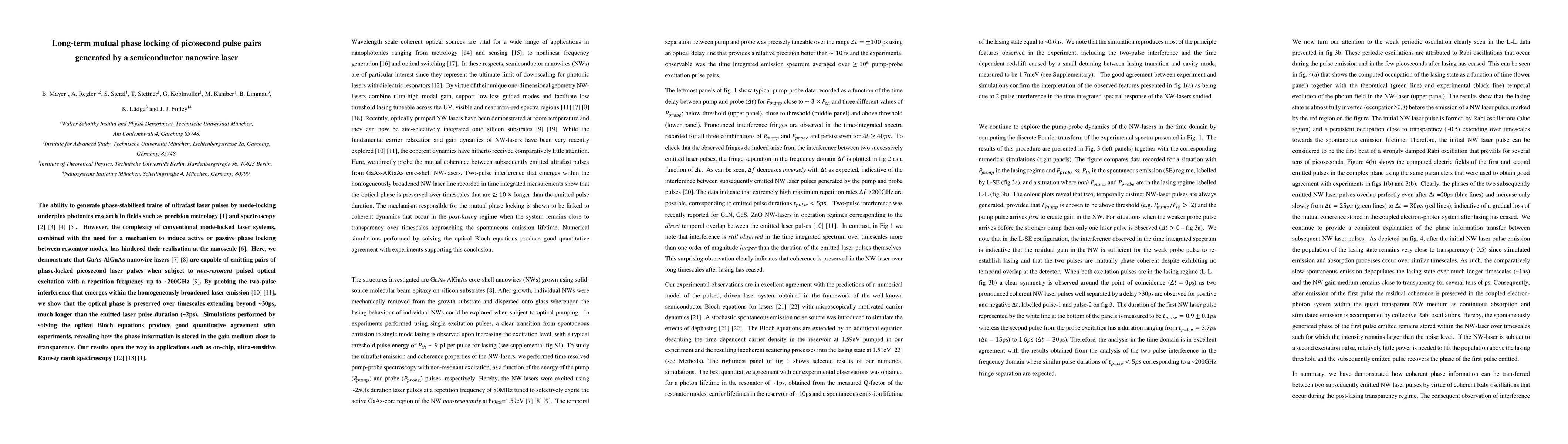 This paper demonstrates that GaAs-AlGaAs nanowire lasers can emit phase-locked picosecond pulse pairs, preserving optical phase over timescales much longer than the pulse duration, which could enable ultra-sensitive on-chip spectroscopy. Simulations using the optical Bloch equations confirm the phase preservation mechanism in the gain medium.