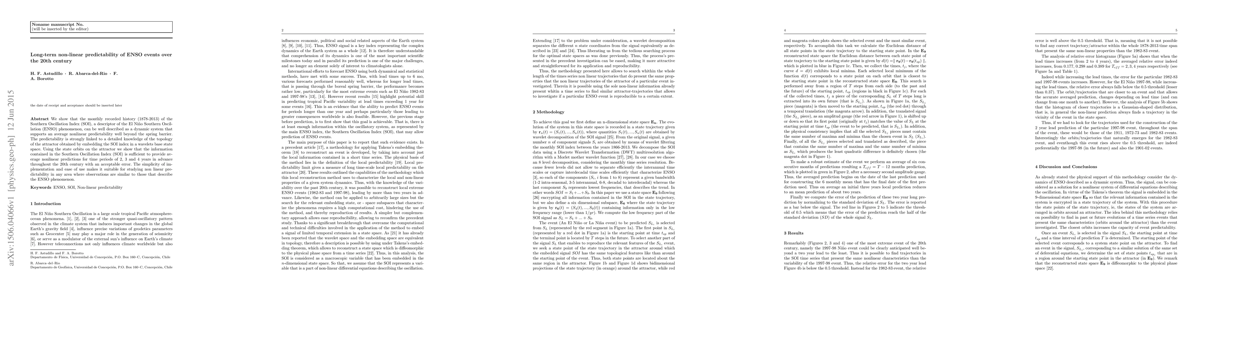 We show that the monthly recorded history (1878-2013) of the Southern Oscillation Index (SOI), a descriptor of the El Ni\~no Southern Oscillation (ENSO) phenomenon, can be well described as a dynamic system that supports an average nonlinear predictability well beyond the spring barrier. The predictability is strongly linked to a detailed knowledge of the topology of the attractor obtained by embedding the SOI index in a wavelets base state space. Using the state orbits on the attractor we show that the information contained in the Southern Oscillation Index (SOI) is sufficient to provide average nonlinear predictions for time periods of 2, 3 and 4 years in advance throughout the 20th century with an acceptable error. The simplicity of implementation and ease of use makes it suitable for studying non linear predictability in any area where observations are similar to those that describe the ENSO phenomenon.