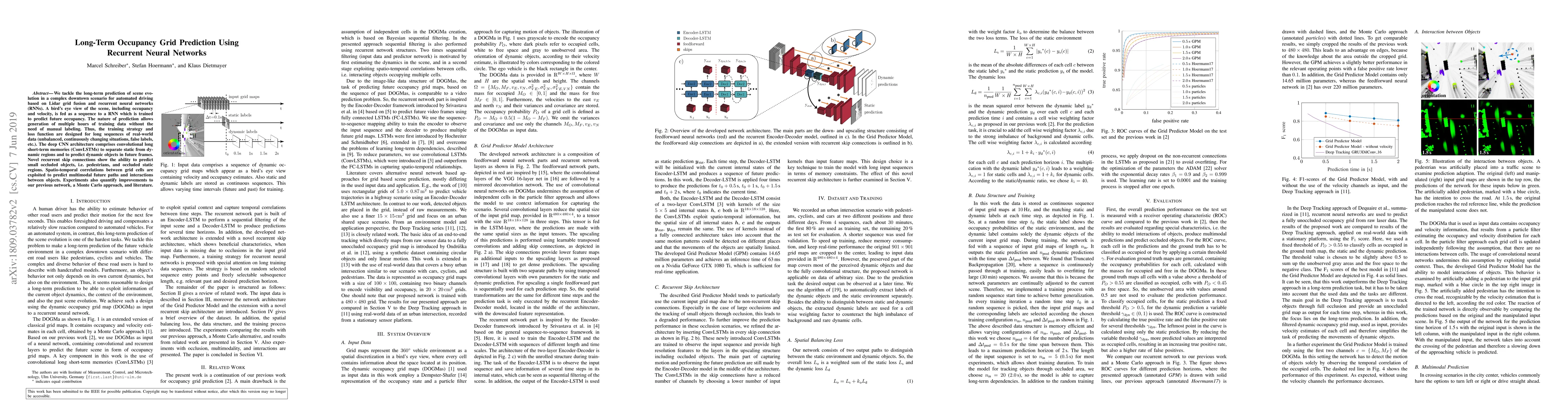 This paper proposes a recurrent neural network (RNN) with ConvLSTMs and skip connections for long-term occupancy grid prediction in automated driving scenarios, leveraging Lidar data to predict dynamic objects and interactions over multiple hours without manual labeling. The approach demonstrates improved predictions for occluded objects and multimodal future paths compared to previous methods.