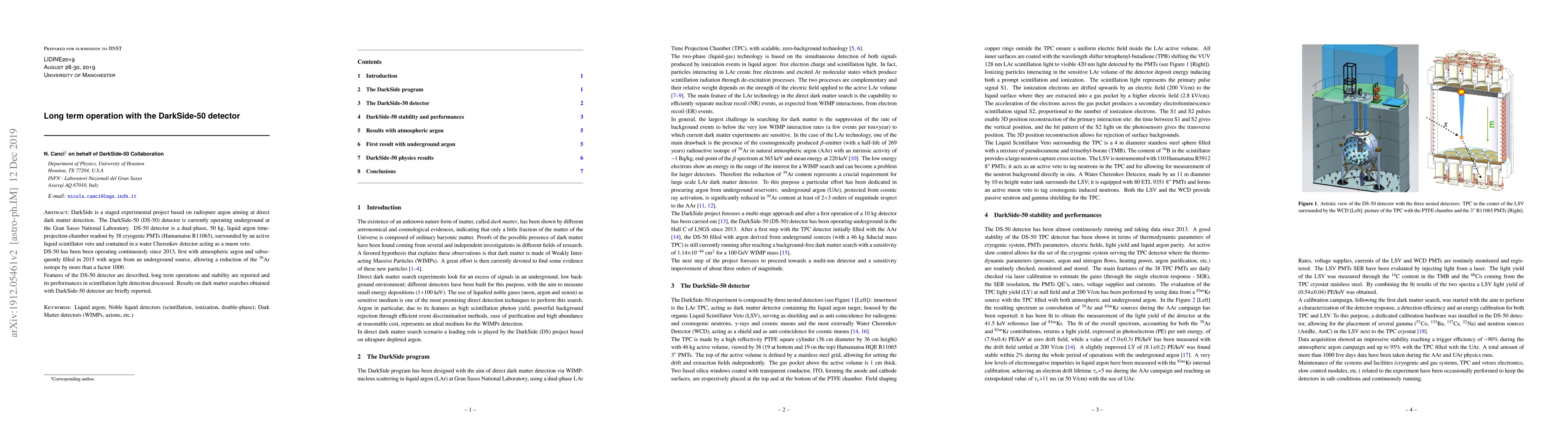 The DarkSide-50 detector, a dual-phase liquid argon time-projection-chamber, has been operating continuously since 2013 for direct dark matter detection, achieving significant reductions in background noise. Its long-term stability and performance in scintillation light detection are reported, along with preliminary results from dark matter searches.