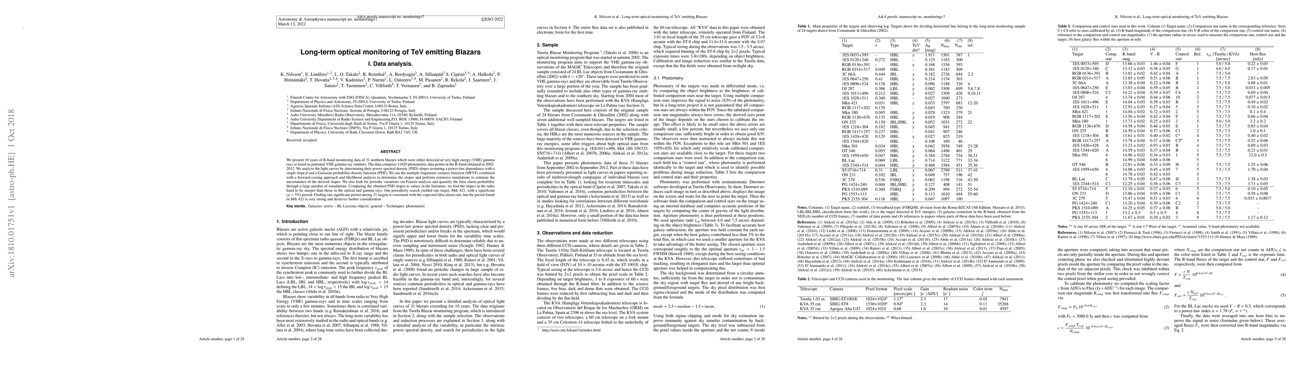 We present 10 years of R-band monitoring data of 31 northern blazars which were either detected at very high energy (VHE) gamma rays or listed as potential VHE gamma-ray emitters. The data comprise 11820 photometric data points in the R-band obtained in 2002-2012. We analyze the light curves by determining their power spectral density (PSD) slopes assuming a power-law dependence with a single slope $\beta$ and a Gaussian probability density function (PDF). We use the multiple fragments variance function (MFVF) combined with a forward-casting approach and likelihood analysis to determine the slopes and perform extensive simulations to estimate the uncertainties of the derived slopes. We also look for periodic variations via Fourier analysis and quantify the false alarm probability through a large number of simulations. Comparing the obtained PSD slopes to values in the literature, we find the slopes in the radio band to be steeper than those in the optical and gamma rays. Our periodicity search yielded one target, Mrk 421, with a significant (p<5%) period. Finding one significant period among 31 targets is consistent with the expected false alarm rate, but the period found in Mrk~421 is very strong and deserves further consideration}.