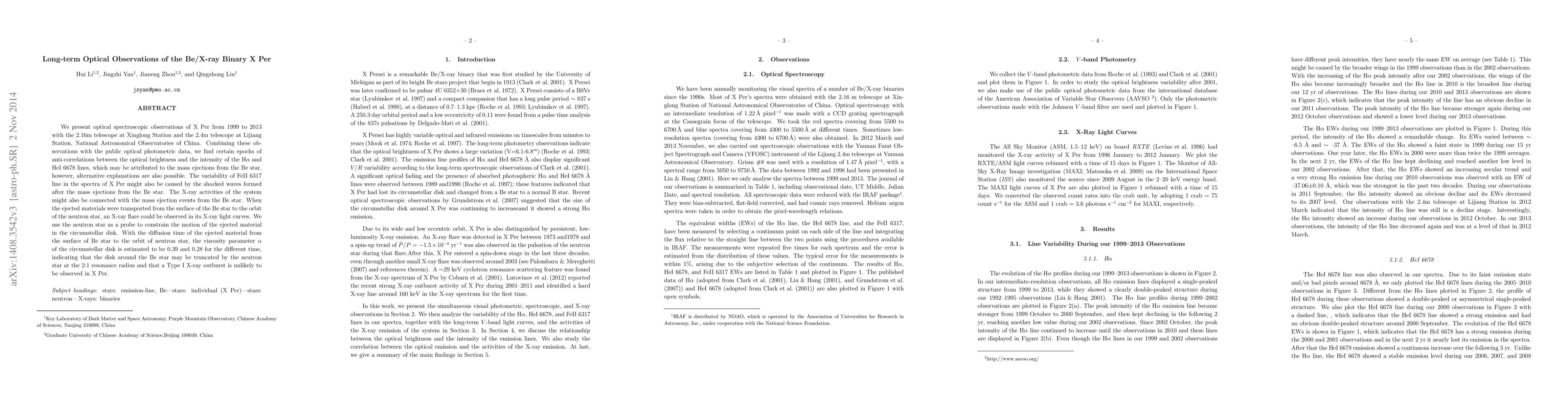 We present the optical spectroscopic observations of X Per from 1999 to 2013 with the 2.16m telescope at Xinglong Station and the 2.4m telescope at Lijiang station, National Astronomical Observatories of China. Combining with the public optical photometric data, we find certain epochs of anti-correlations between the optical brightness and the intensity of the H{\alpha} and HeI 6678 lines, which may be attributed to the mass ejections from the Be star. Alternative explanations are however also possible. The variability of FeII 6317 line in the spectra of X Per might be also caused by the shocked waves formed after the mass ejections from the Be star. The X-ray activities of the system might also be connected with the mass ejection events from the Be star. When the ejected materials were transported from the surface of the Be star to the orbit of neutron star, an X-ray flare could be observed in its X-ray light curves. We use the neutron star as a probe to constrain the motion of the ejected material in the circumstellar disk. With the diffusion time of the ejected material from the surface of Be star to the orbit of neutron star, the viscosity parameter {\alpha} of the circumstellar disk is estimated to be 0.39 and 0.28 for the different time, indicating that the disk around Be star may be truncated by the neutron star at the 2:1 resonance radius and Type I X-ray outburst is unlikely to be observed in X Per.