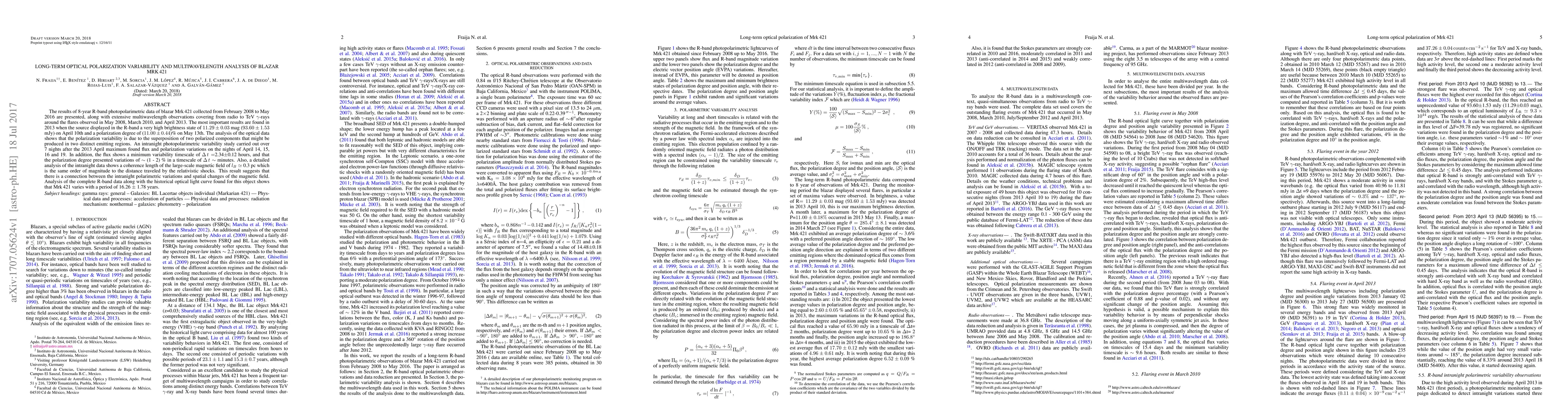 This study analyzes 8 years of optical polarization data from blazar Mrk 421, revealing two polarized components and a connection between magnetic field changes and intranight variations.