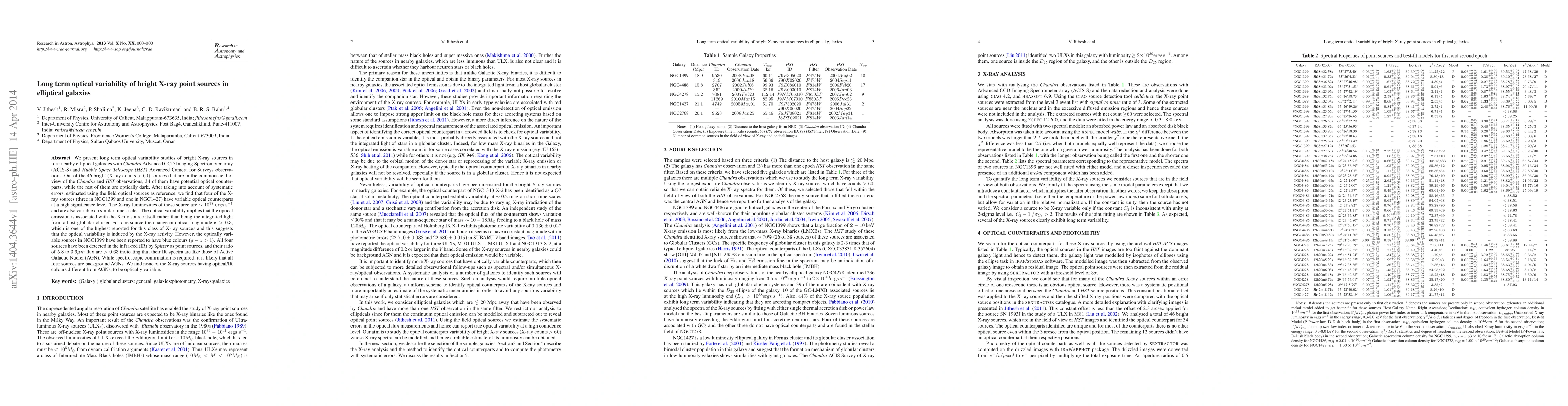 This study investigates long-term optical variability of bright X-ray sources in four elliptical galaxies, identifying four variable sources with significant optical changes. These sources likely represent background Active Galactic Nuclei (AGN) based on their infrared spectra and colors.