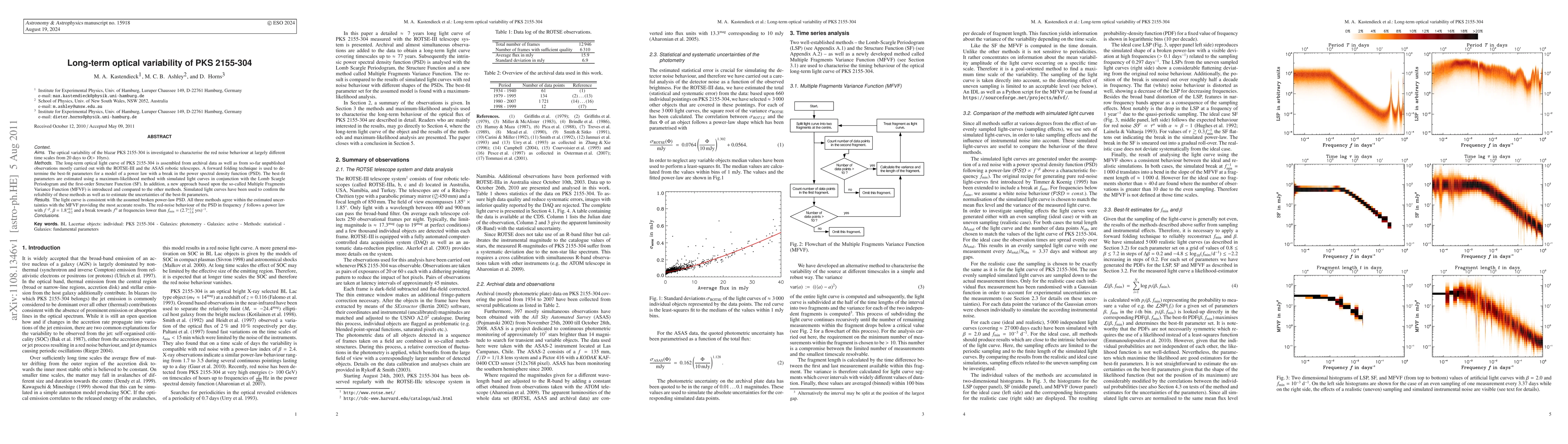 This research investigates the long-term optical variability of blazar PKS 2155-304, revealing red noise behavior across various time scales from 20 days to over a decade. Utilizing data from ROTSE-III and ASAS telescopes, it employs a forward folding technique and maximum-likelihood method with Lomb Scargle Periodogram (LSP) and Structure Function (SF). A novel approach, Multiple Fragments Variance Function (MFVF), is also introduced. Results indicate the light curve aligns with a broken power-law Power Spectral Density (PSD), with a power index of β=1.8±0.2 and a break frequency of f_min=(2.7±1.6) yr^-1, confirming the reliability of the methods using simulated light curves.