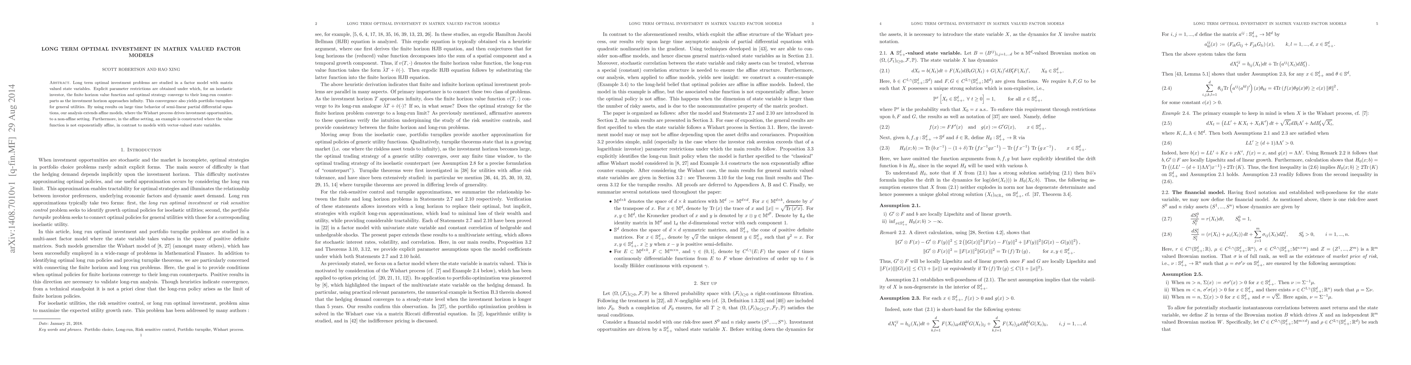 Long term optimal investment problems are studied in a factor model with matrix valued state variables. Explicit parameter restrictions are obtained under which, for an isoelastic investor, the finite horizon value function and optimal strategy converge to their long-run counterparts as the investment horizon approaches infinity. This convergence also yields portfolio turnpikes for general utilities. By using results on large time behaviour of semi-linear partial differential equations, our analysis extends affine models, where the Wishart process drives investment opportunities, to a non-affine setting. Furthermore, in the affine setting, an example is constructed where the value function is not exponentially affine, in contrast to models with vector-valued state variables.