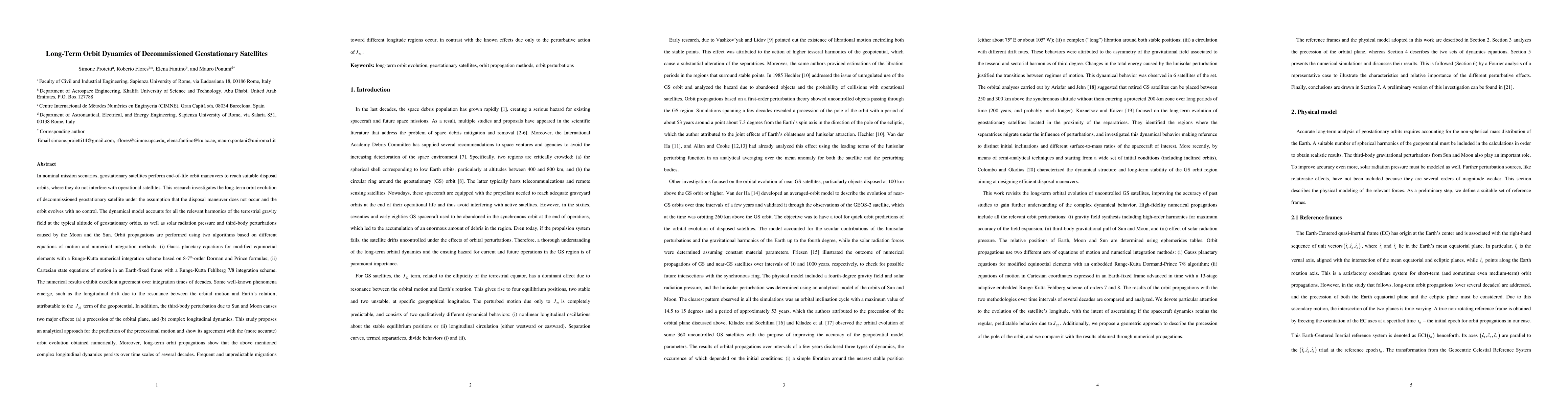In nominal mission scenarios, geostationary satellites perform end-of-life orbit maneuvers to reach suitable disposal orbits, where they do not interfere with operational satellites. This research investigates the long-term orbit evolution of decommissioned geostationary satellite under the assumption that the disposal maneuver does not occur and the orbit evolves with no control. The dynamical model accounts for all the relevant harmonics of the gravity field at the altitude of geostationary orbits, as well as solar radiation pressure and third-body perturbations caused by the Moon and the Sun. Orbit propagations are performed using two algorithms based on different equations of motion and numerical integration methods: (i) Gauss planetary equations for modified equinoctial elements with a Runge-Kutta numerical integration scheme based on 8-7th-order Dorman and Prince formulas; (ii) Cartesian state equations of motion in an Earth-fixed frame with a Runge-Kutta Fehlberg 7/8 integration scheme. The numerical results exhibit excellent agreement over integration times of decades. Some well-known phenomena emerge, such as the longitudinal drift due to the resonance between the orbital motion and Earth's rotation, attributable to the J22 term of the geopotential. In addition, the third-body perturbation due to Sun and Moon causes two major effects: (a) a precession of the orbital plane, and (b) complex longitudinal dynamics. This study proposes an analytical approach for the prediction of the precessional motion and shows its agreement with the orbit evolution obtained numerically. Moreover, long-term orbit propagations show that the above mentioned complex longitudinal dynamics persists over time scales of several decades. Frequent and unpredictable migrations toward different longitude regions occur, in contrast with the known effects due only to the J22 perturbation.
