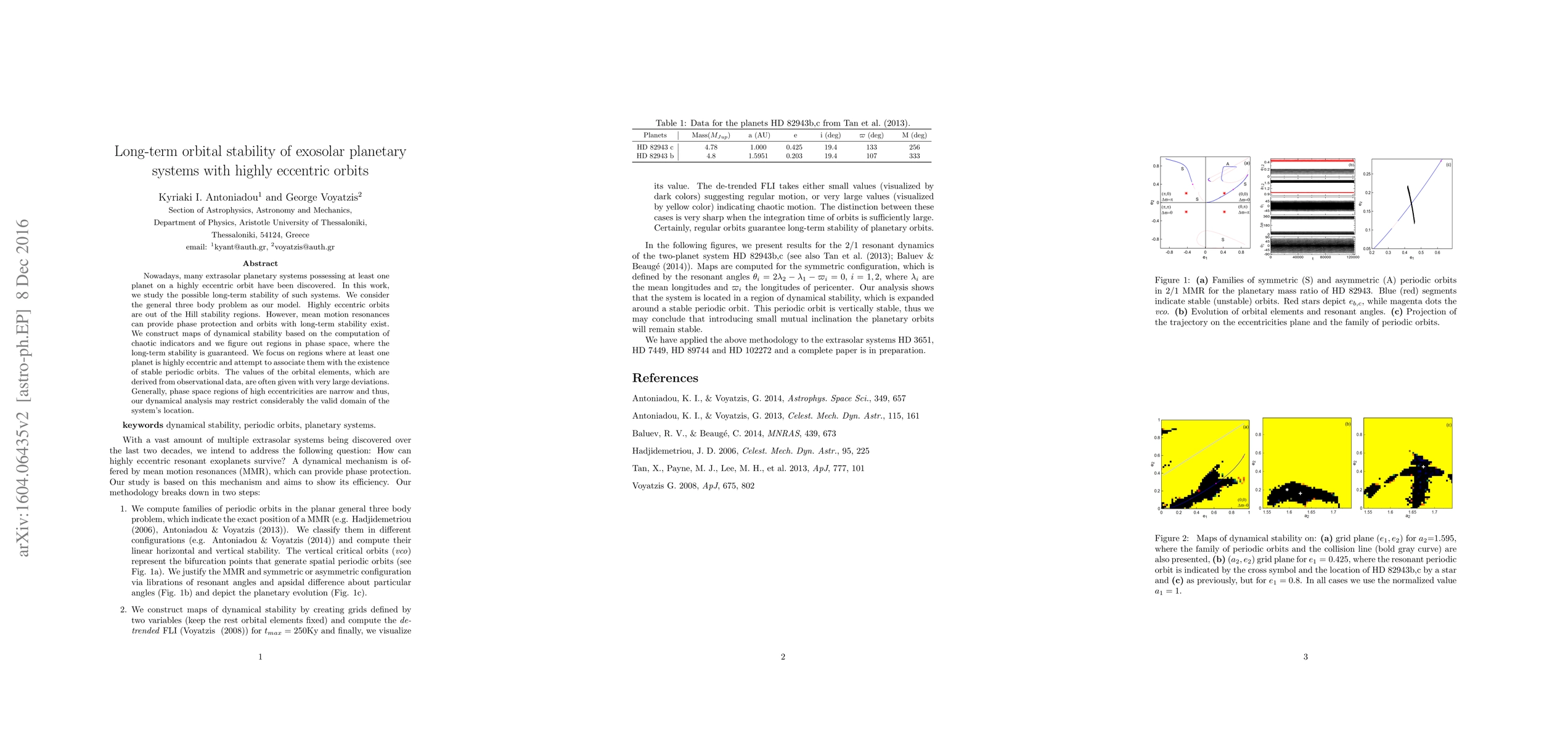 This paper investigates the long-term orbital stability of extrasolar planetary systems with highly eccentric orbits, modeling them through the three-body problem. It finds that while such orbits typically fall outside stability regions, mean motion resonances can offer phase protection, leading to stable periodic orbits within certain dynamical stability maps.