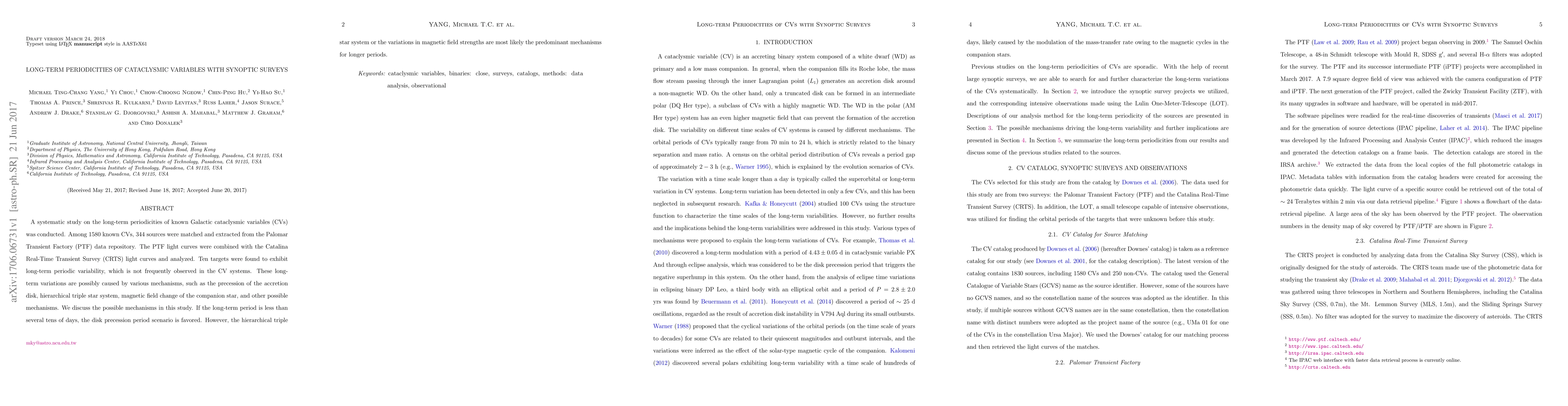 A systematic study on the long-term periodicities of known Galactic cataclysmic variables (CVs) was conducted. Among 1580 known CVs, 344 sources were matched and extracted from the Palomar Transient Factory (PTF) data repository. The PTF light curves were combined with the Catalina Real-Time Transient Survey (CRTS) light curves and analyzed. Ten targets were found to exhibit long-term periodic variability, which is not frequently observed in the CV systems. These long-term variations are possibly caused by various mechanisms, such as the precession of the accretion disk, hierarchical triple star system, magnetic field change of the companion star, and other possible mechanisms. We discuss the possible mechanisms in this study. If the long-term period is less than several tens of days, the disk precession period scenario is favored. However, the hierarchical triple star system or the variations in magnetic field strengths are most likely the predominant mechanisms for longer periods.