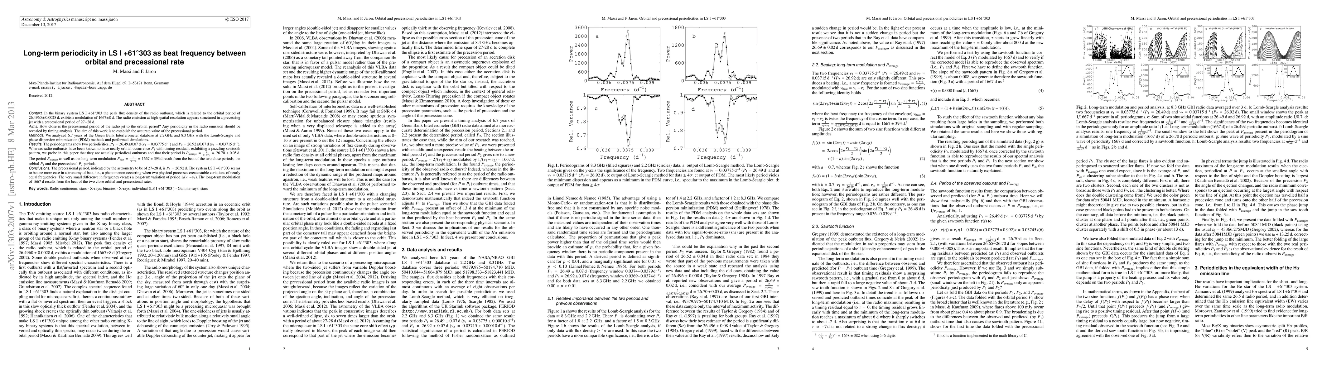 Context: In the binary system LSI+61303 the peak flux density of the radio outburst, which is related to the orbital period of 26.4960 +/- 0.0028d, exibits a modulation of 1667 +/- 8 d. The radio emission at high spatial resolution appears structured in a precessing jet with a precessional period of 27-28 d. Aims: How close is the precessional period of the radio jet to the orbital period? Any periodicity in the radio emission should be revealed by timing analysis. The aim of this work is to establish the accurate value of the precessional period. Methods: We analyzed 6.7 years of the Green Bank Interferometer database at 2.2 GHz and 8.3 GHz with the Lomb-Scargle and phase dispersion minimization (PDM) methods and performed simulations. Results: The periodograms show two periodicities, P1 = 26.49 +/- 0.07 d (\nu1=0.03775 d^{-1}) and P2 = 26.92 +/- 0.07 d (\nu2 = 0.03715 d^{-1}). Whereas radio outbursts have been known to have nearly orbital occurrence P1 with timing residuals exhibiting a puzzling sawtooth pattern, we probe in this paper that they are actually periodical outbursts and that their period is Paverage= (2/(\nu1 + \nu2)= 26.70 +/- 0.05 d. The period Paverage as well as the long-term modulation Pbeat=1/(\nu1 - \nu2)=1667 +/- 393 d result from the beat of the two close periods, the orbital P1 and the precessional P2 periods. Conclusions: The precessional period, indicated by the astrometry to be of 27--28 d, is P2=26.92 d. The system \lsi seems to be one more case in astronomy of beat, i.e., a phenomenon occurring when two physical processes create stable variations of nearly equal frequencies. The very small difference in frequency creates a long-term variation of period 1/(\nu1-\nu2). The long-term modulation of 1667 d results from the beat of the two close orbital and precessional rates.