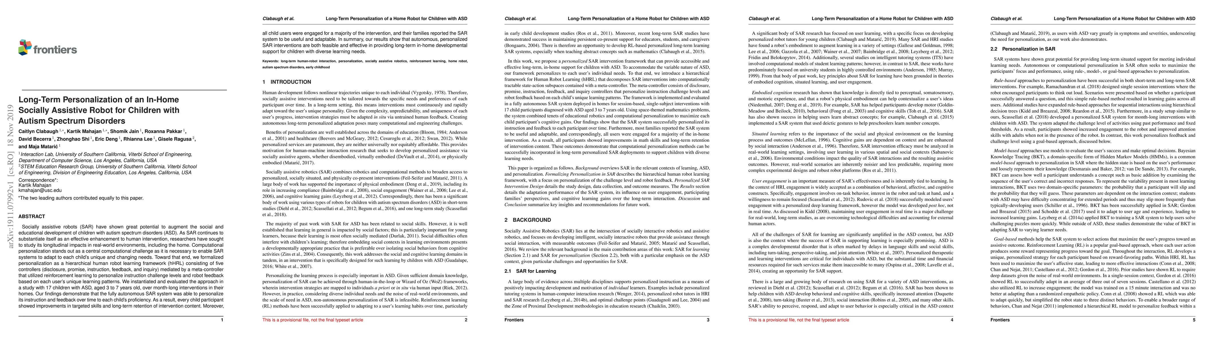 This study explores the long-term personalization of an in-home socially assistive robot (SAR) to enhance the social and educational development of children with autism spectrum disorders (ASD). The robot utilized a hierarchical human robot learning framework to adapt instruction and feedback based on individual learning patterns, resulting in improved skills and long-term retention among participants.