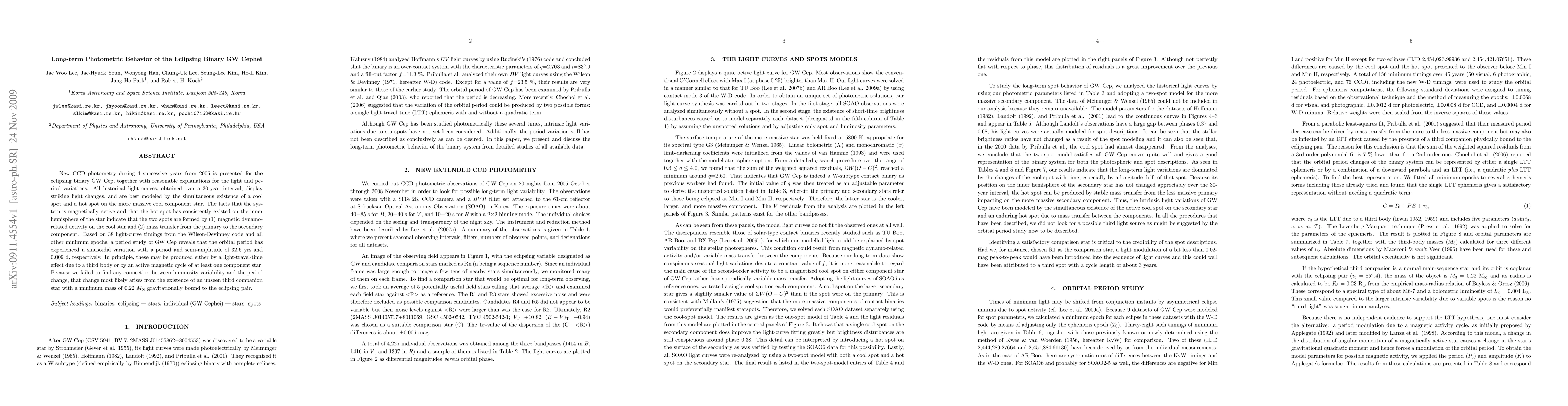 New CCD photometry during 4 successive years from 2005 is presented for the eclipsing binary GW Cep, together with reasonable explanations for the light and period variations. All historical light curves, obtained over a 30-year interval, display striking light changes, and are best modeled by the simultaneous existence of a cool spot and a hot spot on the more massive cool component star. The facts that the system is magnetically active and that the hot spot has consistently existed on the inner hemisphere of the star indicate that the two spots are formed by (1) magnetic dynamo-related activity on the cool star and (2) mass transfer from the primary to the secondary component. Based on 38 light-curve timings from the Wilson-Devinney code and all other minimum epochs, a period study of GW Cep reveals that the orbital period has experienced a sinusoidal variation with a period and semi-amplitude of 32.6 yrs and 0.009 d, respectively. In principle, these may be produced either by a light-travel-time effect due to a third body or by an active magnetic cycle of at least one component star. Because we failed to find any connection between luminosity variability and the period change, that change most likely arises from the existence of an unseen third companion star with a minimum mass of 0.22 $M_\odot$ gravitationally bound to the eclipsing pair.