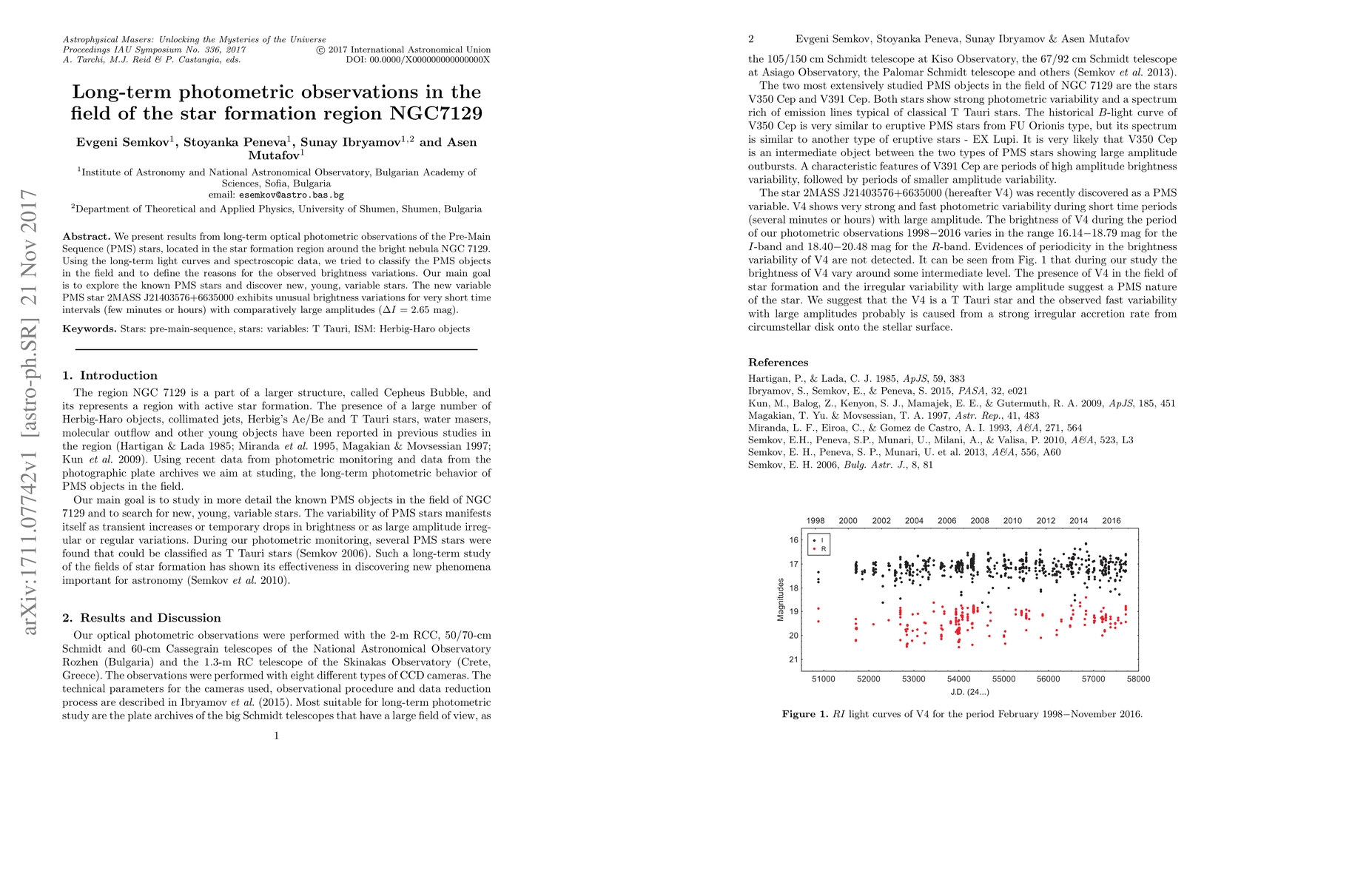 We present results from long-term optical photometric observations of the Pre-Main Sequence (PMS) stars, located in the star formation region around the bright nebula NGC 7129. Using the long-term light curves and spectroscopic data, we tried to classify the PMS objects in the field and to define the reasons for the observed brightness variations. Our main goal is to explore the known PMS stars and discover new, young, variable stars. The new variable PMS star 2MASS J21403576+6635000 exhibits unusual brightness variations for very short time intervals (few minutes or hours) with comparatively large amplitudes (Delta I = 2.65 mag).