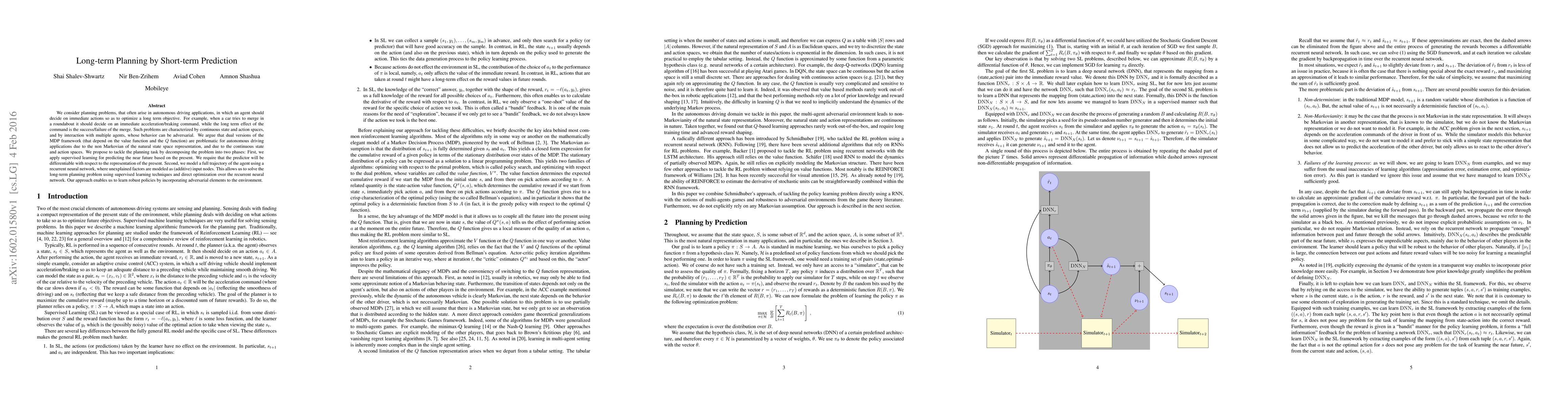 We consider planning problems, that often arise in autonomous driving applications, in which an agent should decide on immediate actions so as to optimize a long term objective. For example, when a car tries to merge in a roundabout it should decide on an immediate acceleration/braking command, while the long term effect of the command is the success/failure of the merge. Such problems are characterized by continuous state and action spaces, and by interaction with multiple agents, whose behavior can be adversarial. We argue that dual versions of the MDP framework (that depend on the value function and the $Q$ function) are problematic for autonomous driving applications due to the non Markovian of the natural state space representation, and due to the continuous state and action spaces. We propose to tackle the planning task by decomposing the problem into two phases: First, we apply supervised learning for predicting the near future based on the present. We require that the predictor will be differentiable with respect to the representation of the present. Second, we model a full trajectory of the agent using a recurrent neural network, where unexplained factors are modeled as (additive) input nodes. This allows us to solve the long-term planning problem using supervised learning techniques and direct optimization over the recurrent neural network. Our approach enables us to learn robust policies by incorporating adversarial elements to the environment.