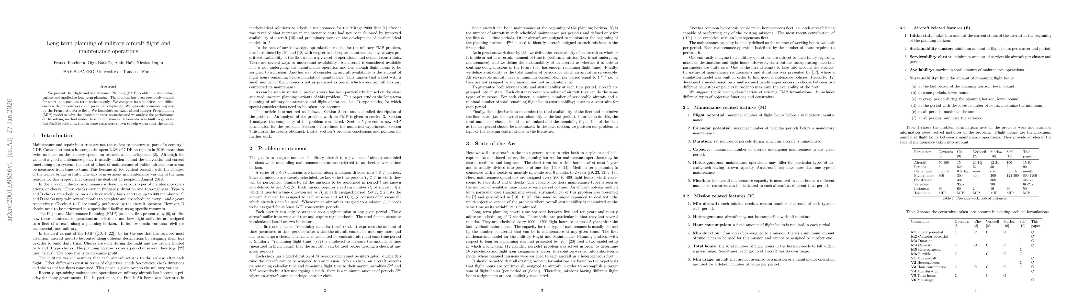 We present the Flight and Maintenance Planning (FMP) problem in its military variant and applied to long term planning. The problem has been previously studied for short- and medium-term horizons only. We compare its similarities and differences with previous work and prove its complexity. We generate scenarios inspired by the French Air Force fleet. We formulate an exact Mixed Integer Programming (MIP) model to solve the problem in these scenarios and we analyse the performance of the solving method under these circumstances. A heuristic was built to generate fast feasible solutions, that in some cases were shown to help warm-start the model.