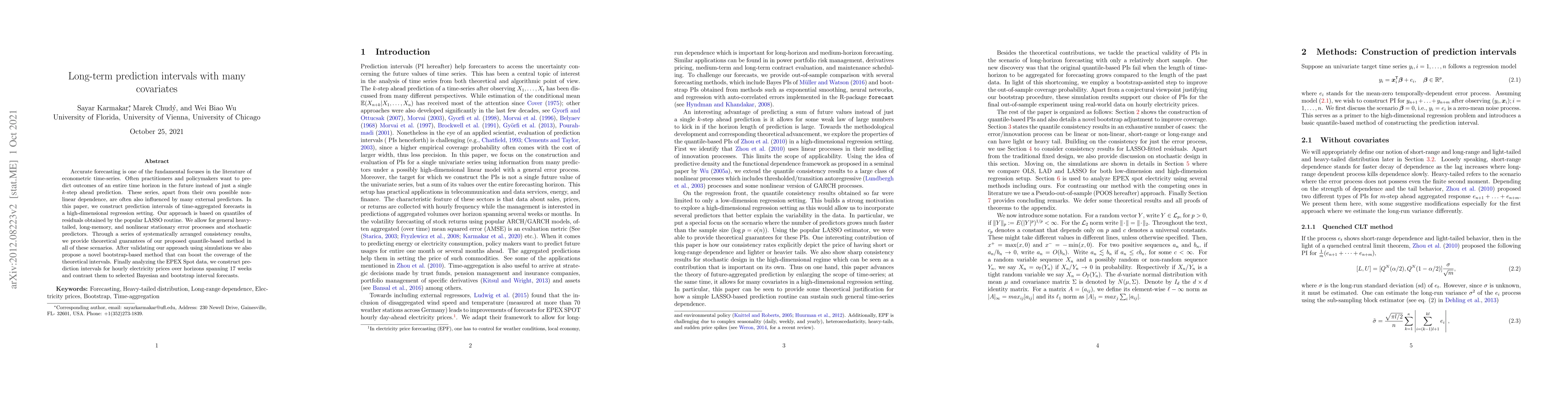 This paper develops a method for constructing long-term prediction intervals in high-dimensional regression settings using quantiles of residuals from LASSO. It provides theoretical consistency guarantees for various error processes and proposes a bootstrap method to enhance coverage, validated through simulations and applied to electricity price forecasting.