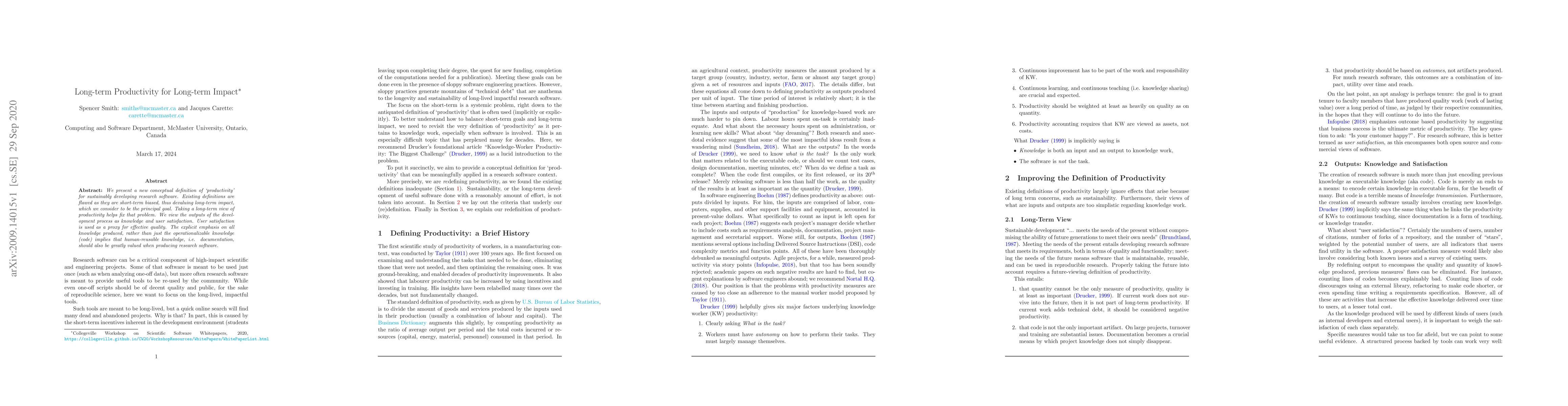We present a new conceptual definition of 'productivity' for sustainably developing research software. Existing definitions are flawed as they are short-term biased, thus devaluing long-term impact, which we consider to be the principal goal. Taking a long-term view of productivity helps fix that problem. We view the outputs of the development process as knowledge and user satisfaction. User satisfaction is used as a proxy for effective quality. The explicit emphasis on all knowledge produced, rather than just the operationalizable knowledge (code) implies that human-reusable knowledge, i.e. documentation, should also be greatly valued when producing research software.