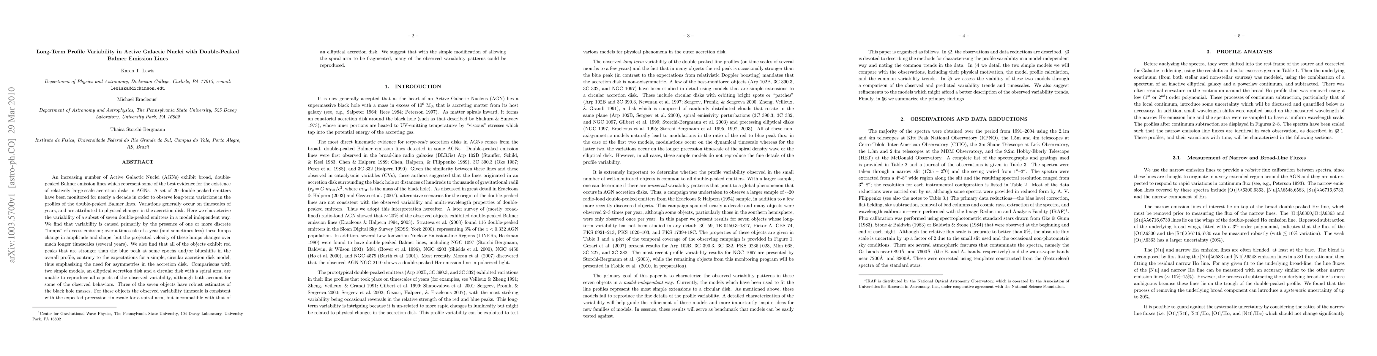 This study monitors long-term variations in 20 AGNs with double-peaked Balmer emission lines, revealing that variability is primarily due to changes in discrete emission "lumps" over years. The observed asymmetries in the profiles suggest the need for non-circular accretion disk models, with spiral arms potentially explaining the variability better than elliptical disks.