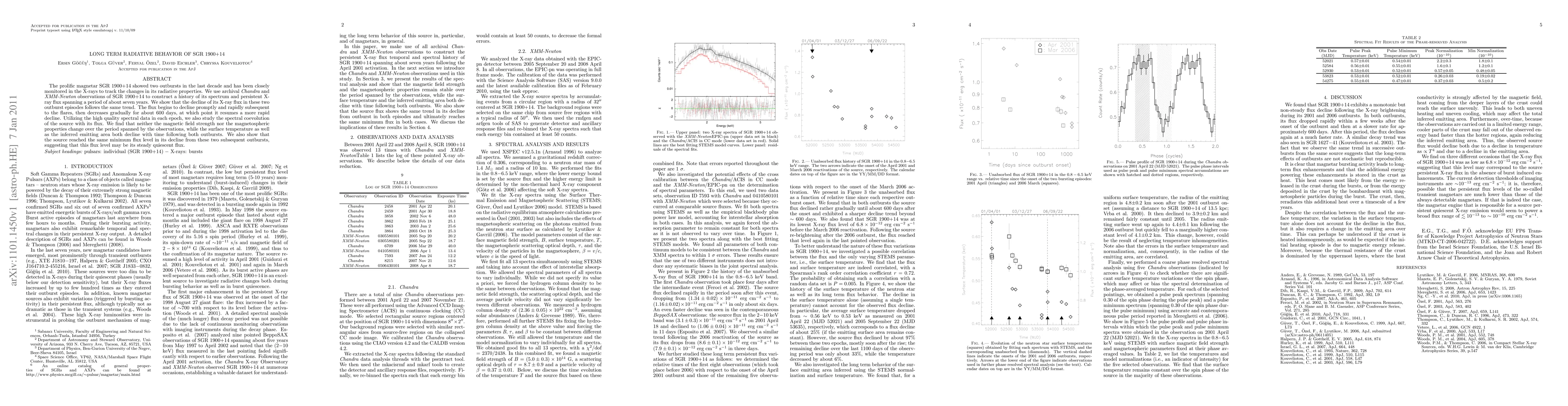 The SGR 1900+14 magnetar's X-ray flux declines after outbursts in a similar pattern over 7 years, with surface temperature and emitting area also decreasing, suggesting a steady quiescent flux level.