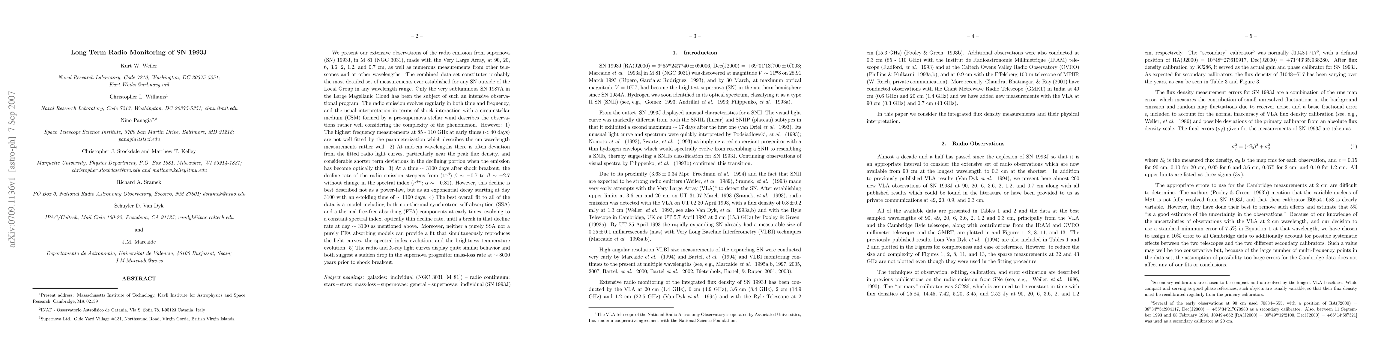 We present our observations of the radio emission from supernova (SN) 1993J, in M 81 (NGC 3031), made with the VLA, from 90 to 0.7 cm, as well as numerous measurements from other telescopes. The combined data set constitutes probably the most detailed set of measurements ever established for any SN outside of the Local Group in any wavelength range. Only SN 1987A in the LMC has been the subject of such an intensive observational program. The radio emission evolves regularly in both time and frequency, and the usual interpretation in terms of shock interaction with a circumstellar medium (CSM) formed by a pre-SN stellar wind describes the observations rather well considering the complexity of the phenomenon. However: 1) The 85 - 110 GHz measurements at early times are not well fitted by the parameterization, unlike the cm wavelength measurements. 2) At mid-cm wavelengths there is some deviation from the fitted radio light curves. 3) At a time ~3100 days after shock breakout, the decline rate of the radio emission steepens without change in the spectral index. This decline is best described as an exponential decay starting at day 3100 with an e-folding time of ~1100 days. 4) The best overall fit to all of the data is a model including both non-thermal synchrotron self-absorption (SSA) and a thermal free-free absorbing (FFA) components at early times, evolving to a constant spectral index, optically thin decline rate, until the break in that decline rate. Moreover, neither a purely SSA nor a purely FFA absorbing models can provide a fit that simultaneously reproduces the light curves, the spectral index evolution, and the brightness temperature evolution. 5) The radio and X-ray light curves exhibit similar behavior and suggest a sudden drop in the SN progenitor mass-loss rate at ~8000 years prior to shock breakout.