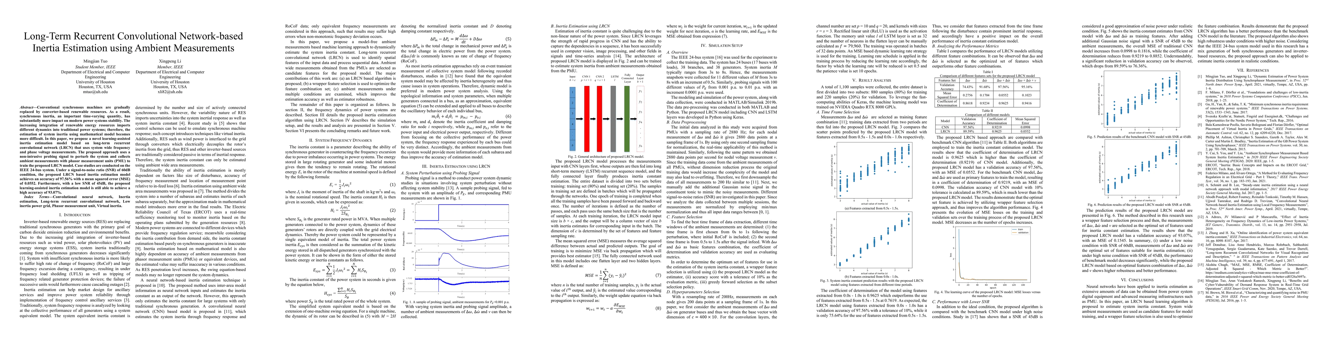 This paper proposes a novel long-term recurrent convolutional network (LRCN) model for estimating system inertia using ambient measurements from frequency and phase voltage. The model achieves high accuracy even under low signal-to-noise ratios, demonstrating its effectiveness in modern power systems with increased renewable energy integration.