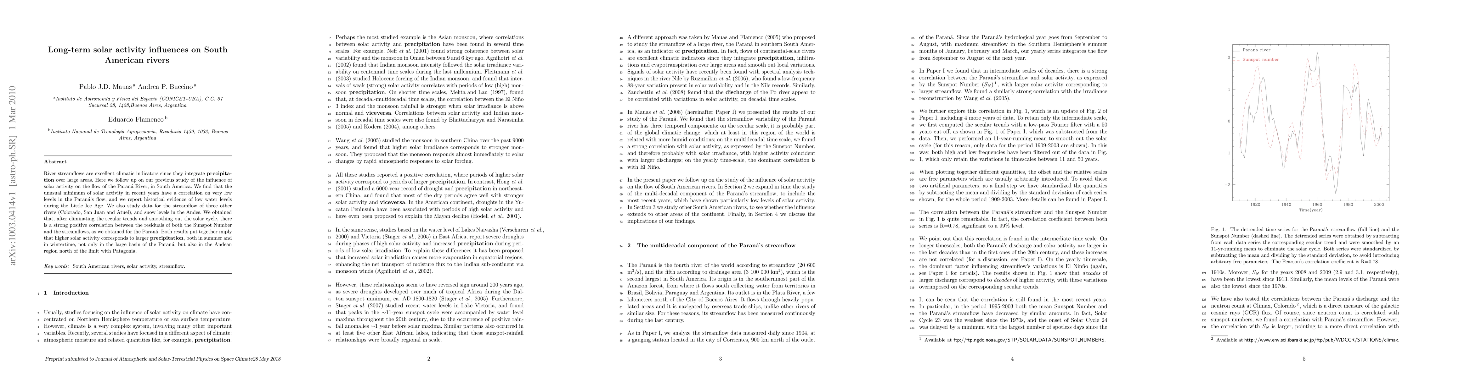 This study investigates the long-term influence of solar activity on South American river streamflows, finding a strong correlation between solar cycles and river flow levels, particularly during low solar activity periods. The results suggest that higher solar activity leads to increased precipitation and higher river flows across the Parana basin and the Andean region.