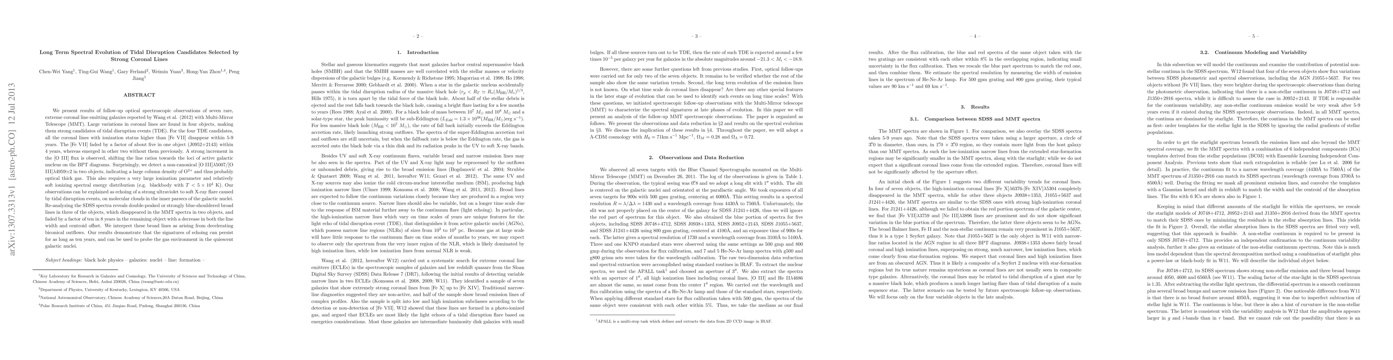 We present results of follow-up optical spectroscopic observations of seven rare, extreme coronal line emitting galaxies reported by Wang et al. (2012) with Multi-Mirror Telescope (MMT). Large variations in coronal lines are found in four objects, making them strong candidates of tidal disruption events (TDE). For the four TDE candidates, all the coronal lines with ionization status higher than [Fe VII] disappear within 5-9 years. The [Fe VII] faded by a factor of about five in one object (J0952+2143) within 4 years, whereas emerged in other two without them previously. A strong increment in the [O III] flux is observed, shifting the line ratios towards the loci of active galactic nucleus on the BPT diagrams. Surprisingly, we detect a non-canonical [O III]5007/[O III]4959 2 in two objects, indicating a large column density of O$^{2+}$ and thus probably optical thick gas. This also requires a very large ionization parameter and relatively soft ionizing spectral energy distribution (e.g. blackbody with $T < 5\times 10^4$ K). Our observations can be explained as echoing of a strong ultraviolet to soft X-ray flare caused by tidal disruption events, on molecular clouds in the inner parsecs of the galactic nuclei. Re-analyzing the SDSS spectra reveals double-peaked or strongly blue-shouldered broad lines in three of the objects, which disappeared in the MMT spectra in two objects, and faded by a factor of ten in 8 years in the remaining object with a decrease in both the line width and centroid offset. We interpret these broad lines as arising from decelerating biconical outflows. Our results demonstrate that the signatures of echoing can persist for as long as ten years, and can be used to probe the gas environment in the quiescent galactic nuclei.