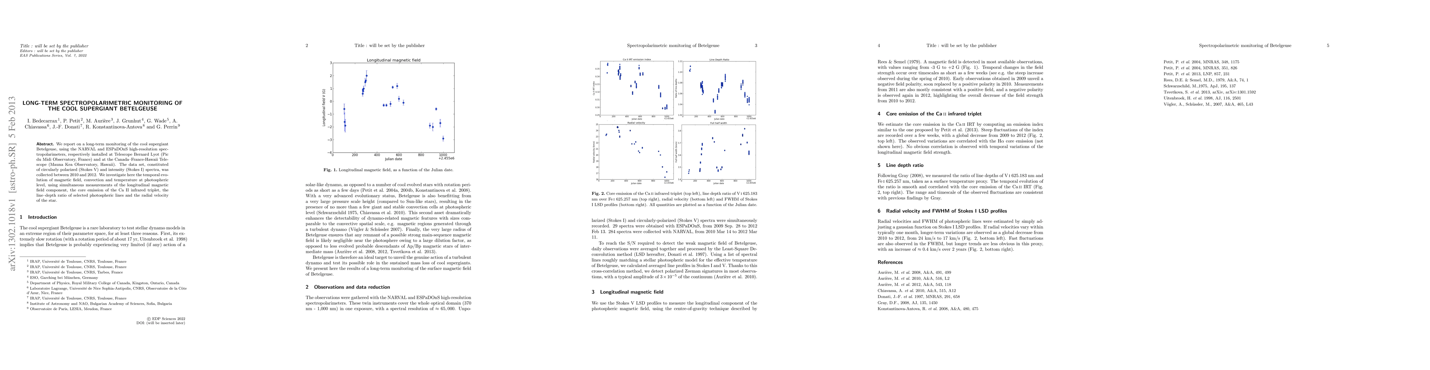 We report on a long-term monitoring of the cool supergiant Betelgeuse, using the NARVAL and ESPaDOnS high-resolution spectropolarimeters, respectively installed at Telescope Bernard Lyot (Pic du Midi Observatory, France) and at the Canada-France-Hawaii Telescope (Mauna Kea Observatory, Hawaii). The data set, constituted of circularly polarized (Stokes V) and intensity (Stokes I) spectra, was collected between 2010 and 2012. We investigate here the temporal evolution of magnetic field, convection and temperature at photospheric level, using simultaneous measurements of the longitudinal magnetic field component, the core emission of the Ca II infrared triplet, the line-depth ratio of selected photospheric lines and the radial velocity of the star.